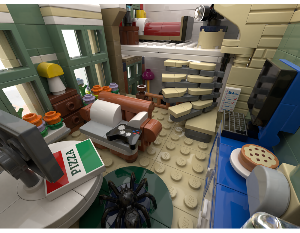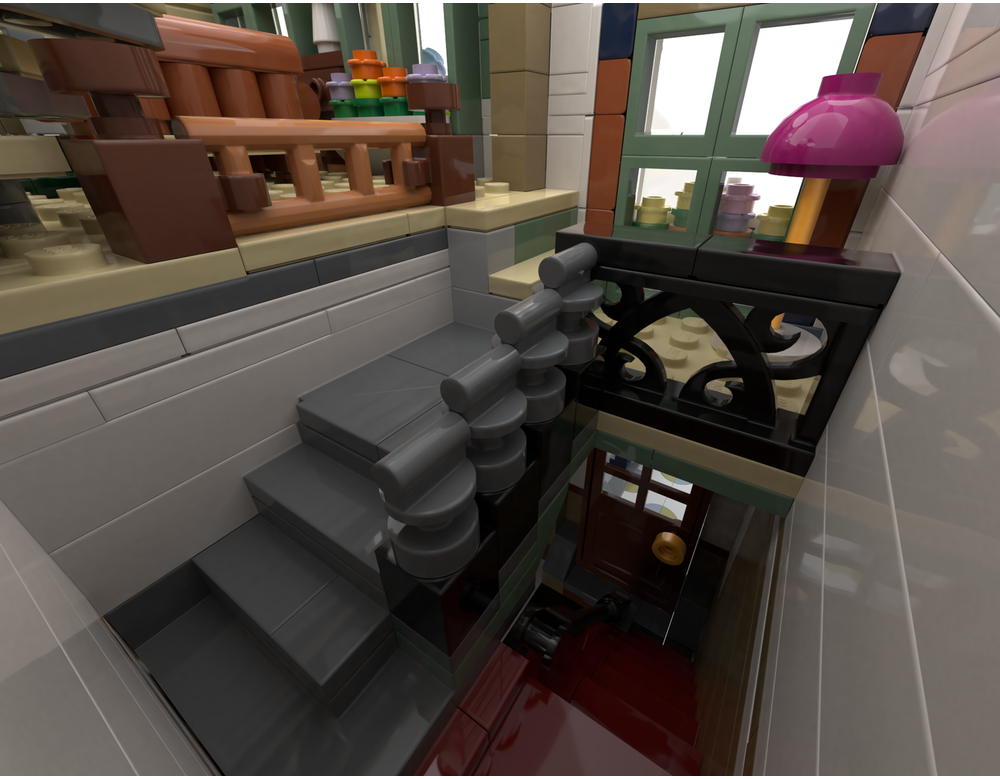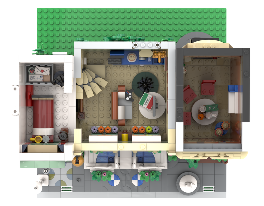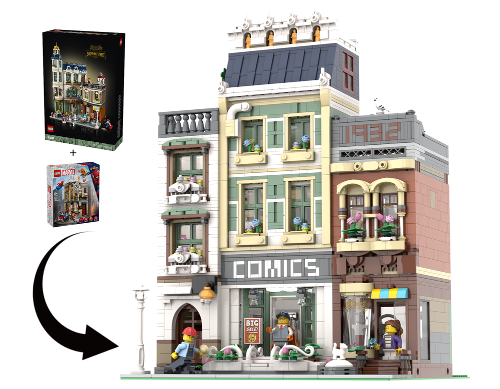 The talented fan designer has taken the 3,000 plus piece set (plus a smaller one) and given it a Comic Book shop makeover. The build is an alternate design of the Shopping Street (11371) and Peter Parker’s Apartment (76317) sets, using parts found in both, nothing more. It keeps some of the original sets features including colour schemes, but built in a completely different way, it even has the word COMIC above the shop. The indent made by the two angled buildings is gone and instead is a typical row of shops with a fancy front step.