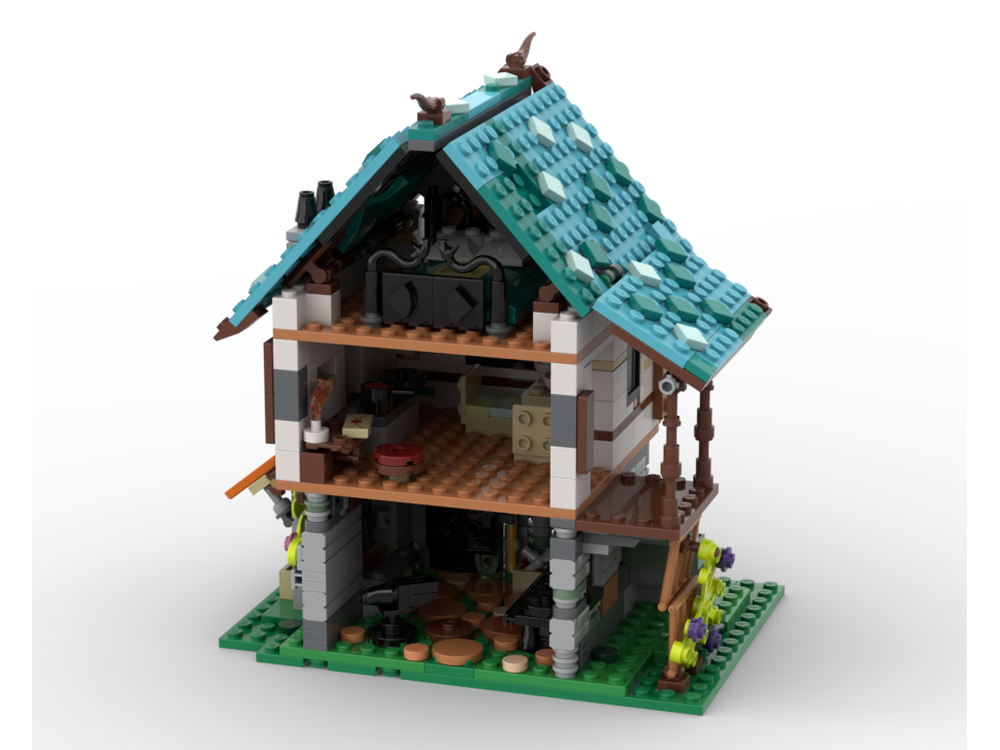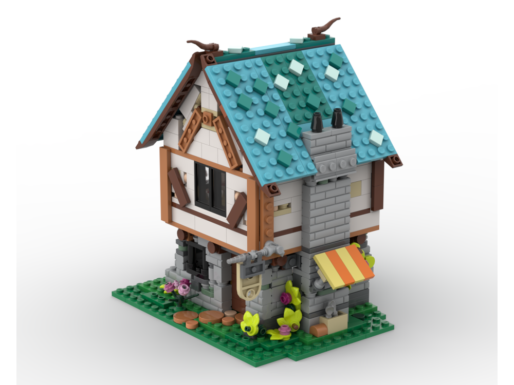 MIJbricks was inspired by the LEGO Ideas Medieval Blacksmith (21325) set from 2021, you can clearly see which design elementsade the cut just by looking at the shape. This smaller but equally as awesome Medieval Blacksmith build can be constructed using only the pieces from the Cozy House set. It features a 3 floor Medieval house, with an open back to access the interior. The ground floor consists of the Blacksmith workshop with the anvil and working millstone. Above is the kitchen and dining room. The top floor consists of the bedroom. The exterior is very detailed; on the right of the build there is a small market, and on the left, some stairs to access above.