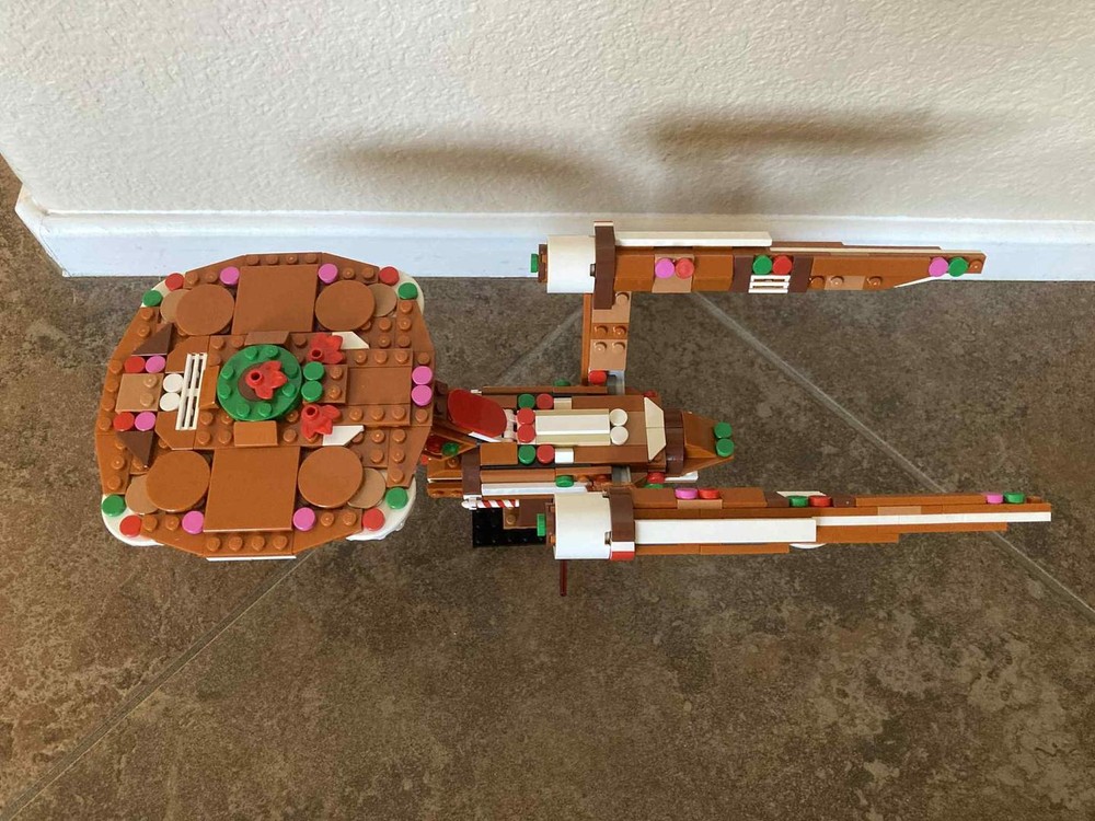 The talented designer, CreationCaravan (Brad Barber), has taken the recently released and still on backorder LEGO Gingerbread AT-AT Walker and transformed it into the U.S.S Enterprise from Star Trek, complete with a festive wreath Command Bridge. The creator has done a great job in recreating the iconic disc shape using only parts available in the original set. From the long brick-built thrusters and gingerbread bodywork to the candy cane photon canons, the white icing trim in the perfrct finishing touch. It joins the many other alternative builds in Gingerbread form that we’ve shared over the last few weeks.