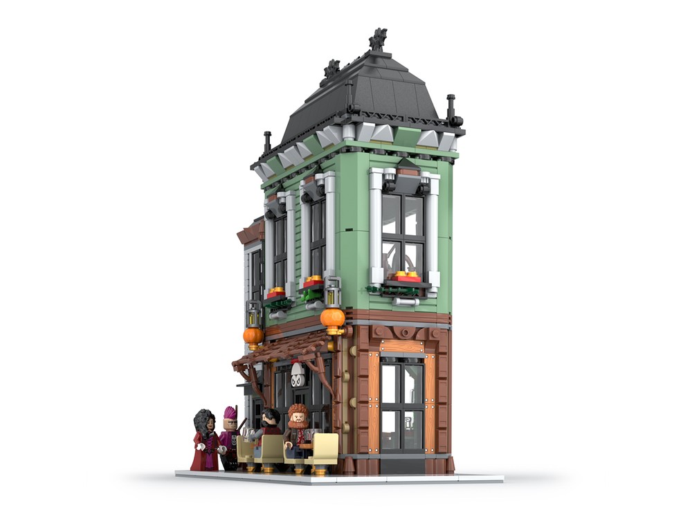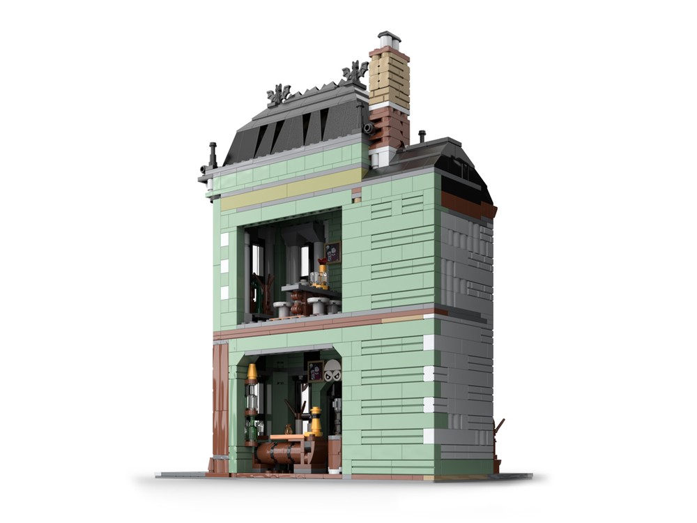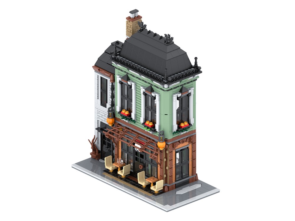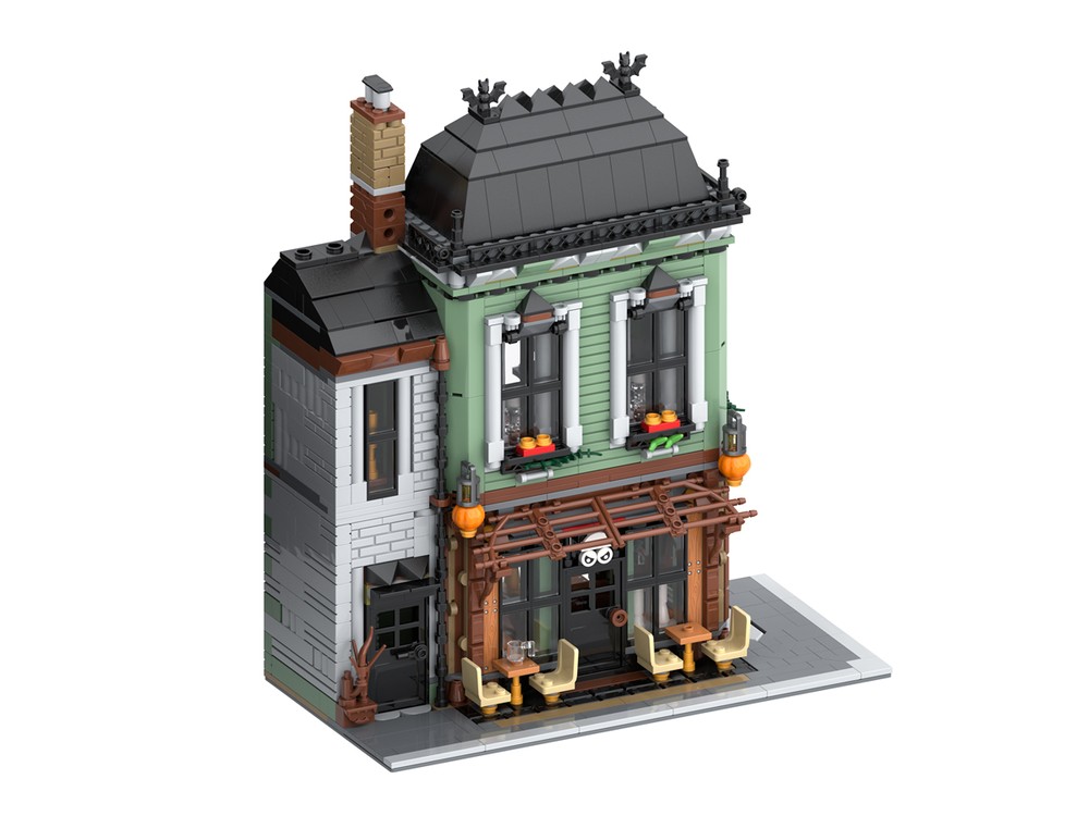 The alternative design can be found on his Rebrickable account, where you’ll also find the instructions which costs a very reasonable $10, along with a parts list needed to build this yourself. At the end you’ll have a spooky looking but cool Haunted Tavern, complete with seating inside & out, along with many details including a bar, cups spooky ornaments and so much more. It fits on a 16×32 sized plate and is a corner building made-up of two modules, just like a modular building.