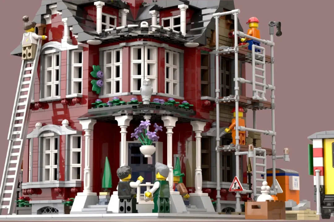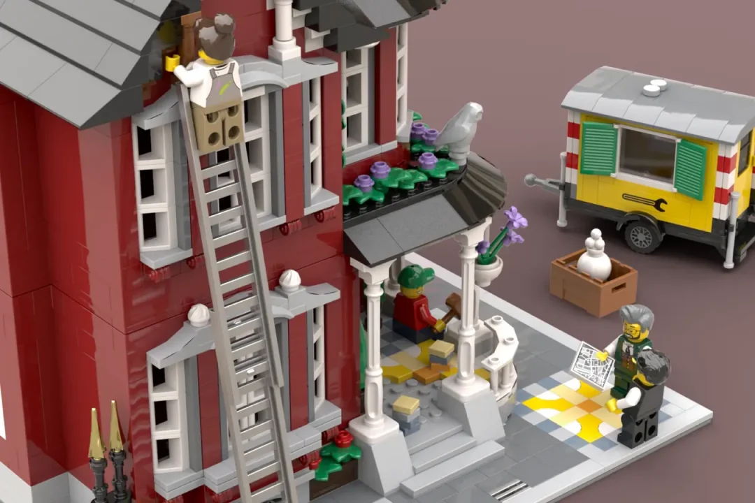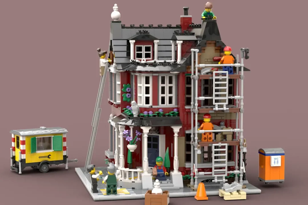 With the rumours of the next official LEGO Modular Building being a couple of Townhouses, I thought it was extremely apt to showcase this one. The difference with MaMiMo‘s creation is that it’s partly through a makeover and comes complete with a crane, scaffolding and a decorating team.