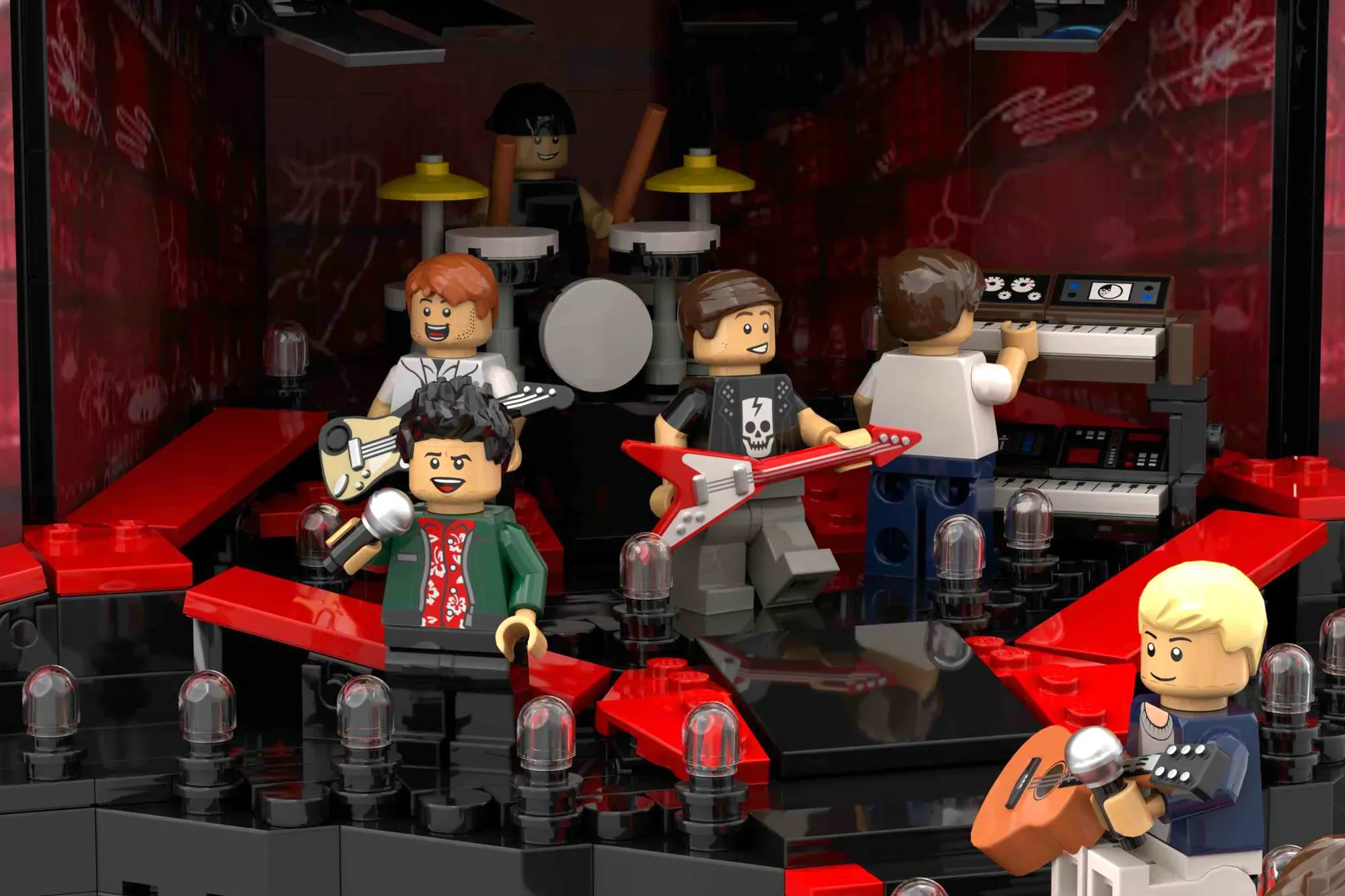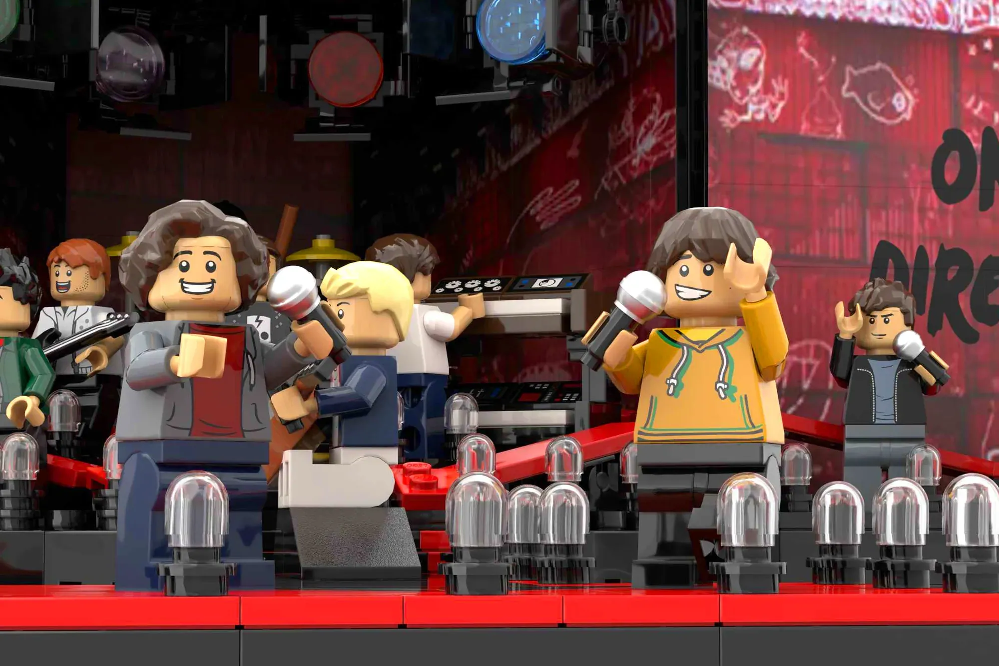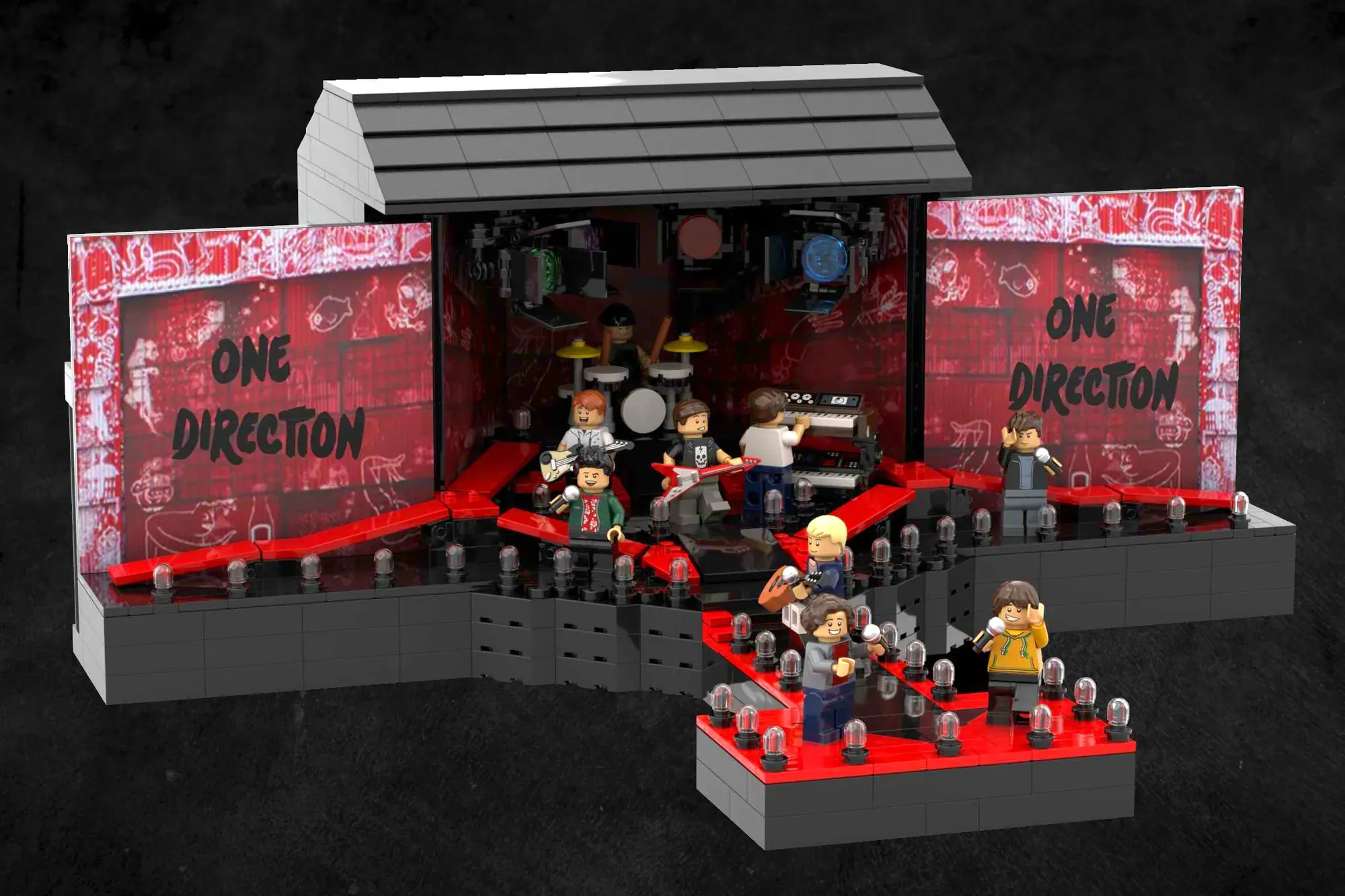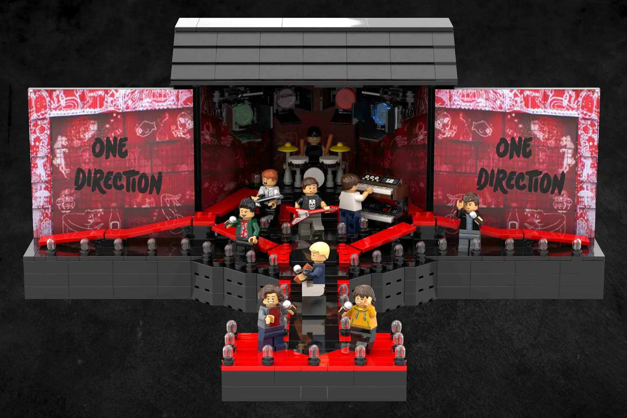 Each Minifigure represents a member of the group, Liam Payne, Zayn Malik, Harry Styles, Niall Horan and Louis Tomlinson, each interacting with the audience and reflecting their personality on stage, making the model come to life from every angle.