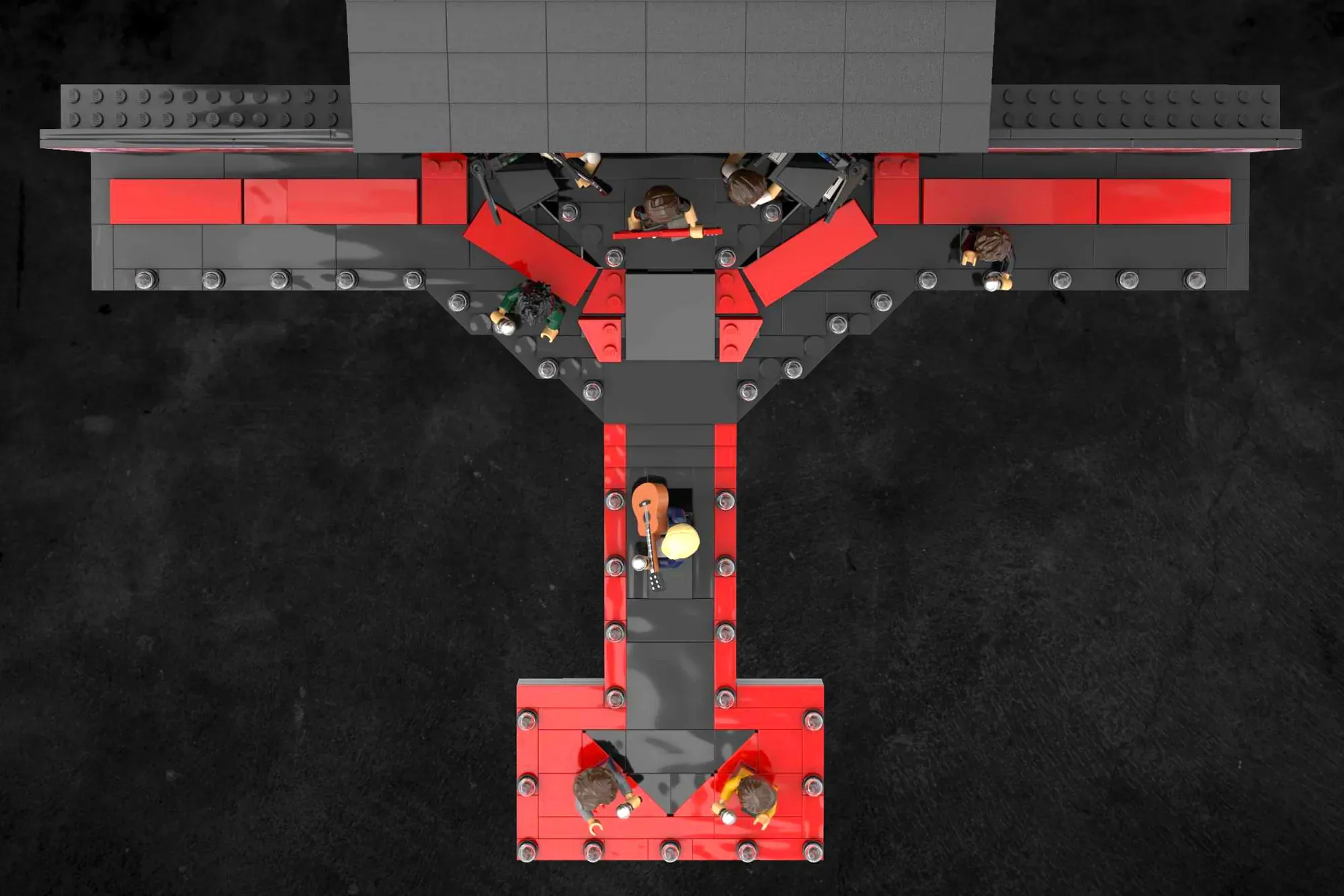 The fan designer, Josh Bricks, has created a full concert stage, with a main platform and front walkway in red, side walkways and screens with the band’s name, an elevated area for the drummer, lighting on the front of the stage and numerous technical details. The stage includes the full band along with their instruments – drums, guitars, keyboard and microphones.