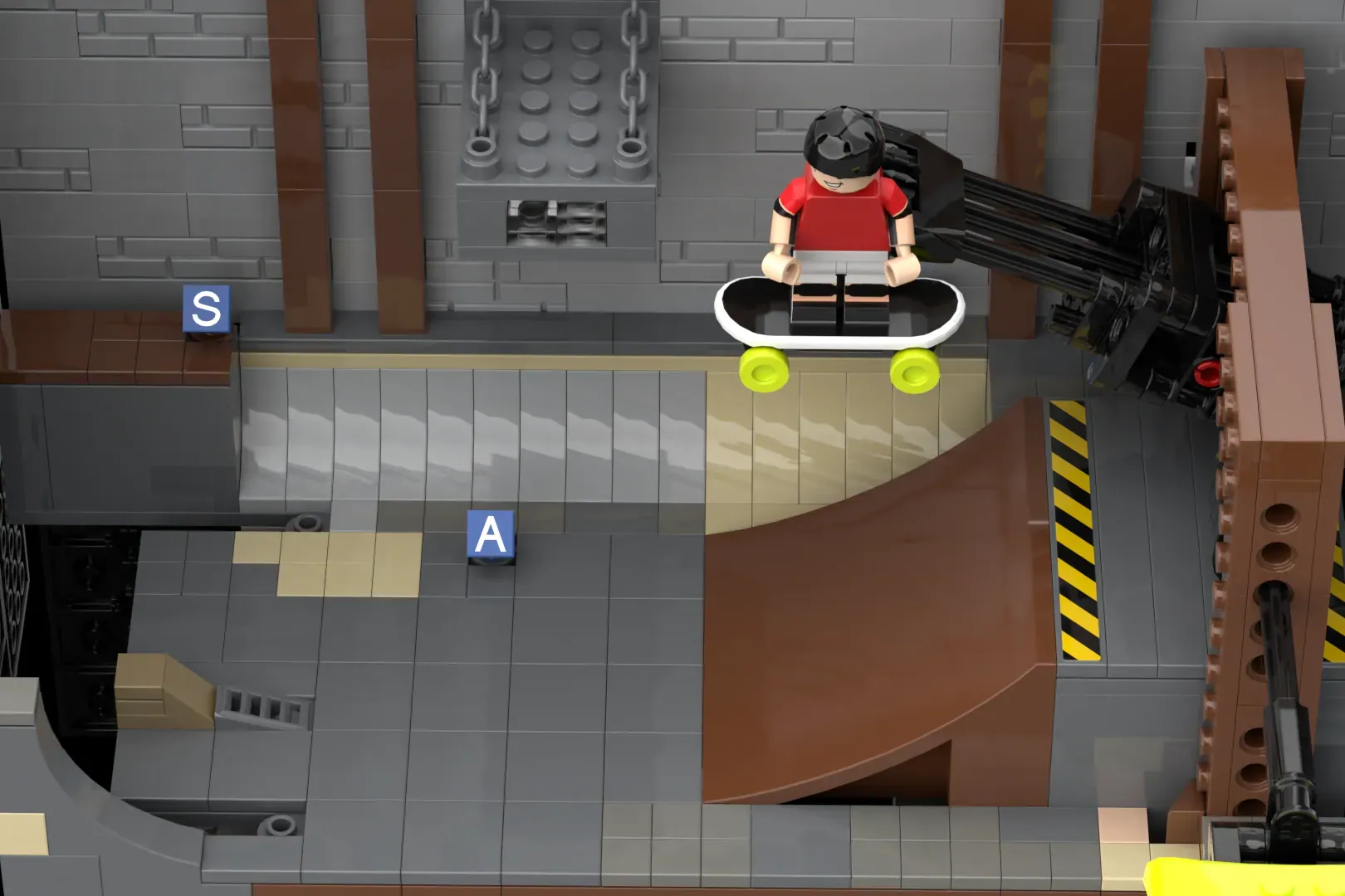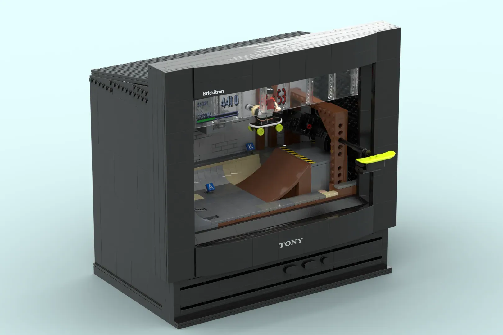The fan designer, ArcadeBricker, has created a fully functional brick-built Skate simulator complete with a skateboard joystick. You’ll use Tech-Deck/fingerboard controls to tilt the skater forward, backward and side-to-side, you can even perform flips and grind on rails. The counterweight allows you to catch serious air, just like in the game. LED’s provide ample light for the inside of the TV set and you can even design your own course.