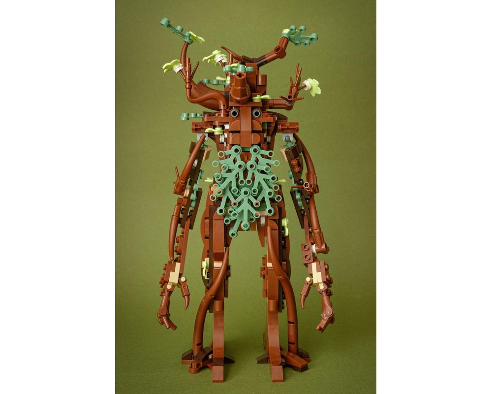The talented fan designer Terauma is back with an awesome alt build of a relatively affordable set, the LEGO Love Birds (21365). The build takes the parts found in the above set and transforms them into Treebeard, a tree-giant character in J. R. R. Tolkien’s The Lord of the Rings. He is an Ent and is said by Gandalf to be “the oldest living thing that still walks beneath the Sun upon this Middle-earth.” He lives in the ancient Forest of Fangorn, where he awakens once again to aid the Fellowship of the Ring.