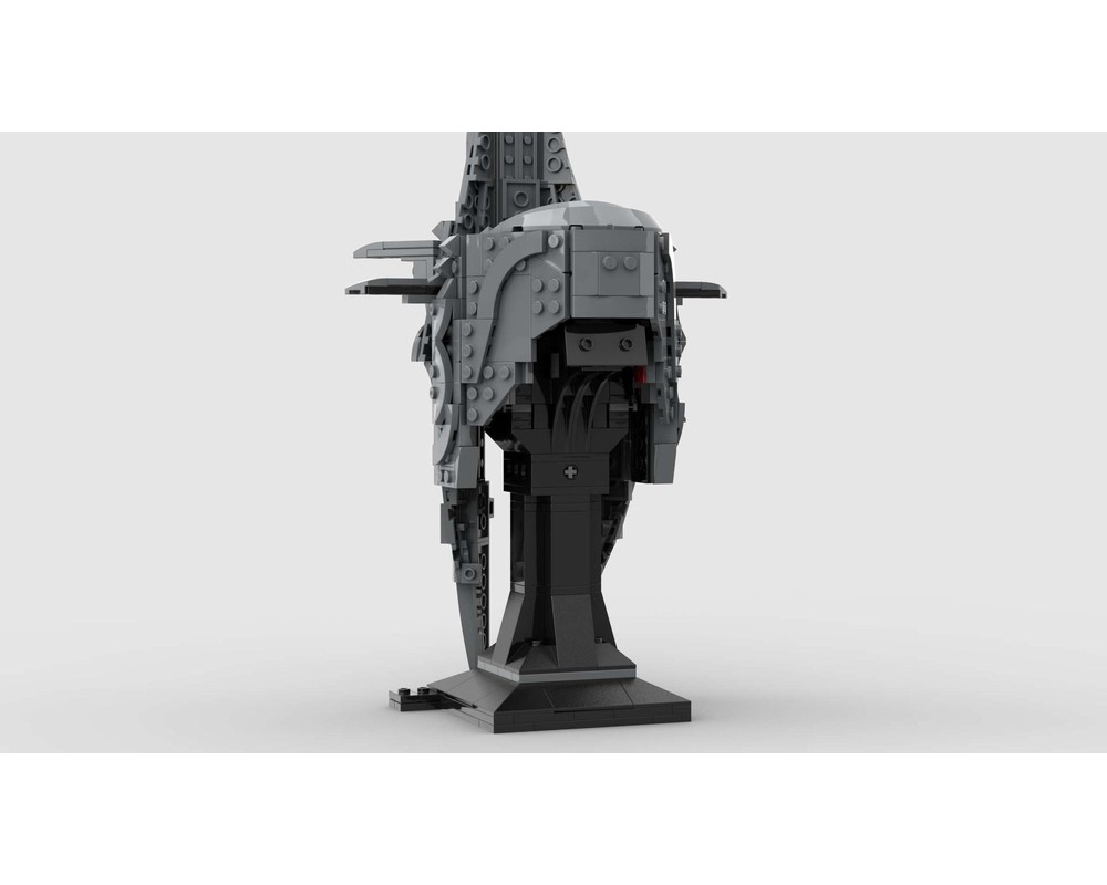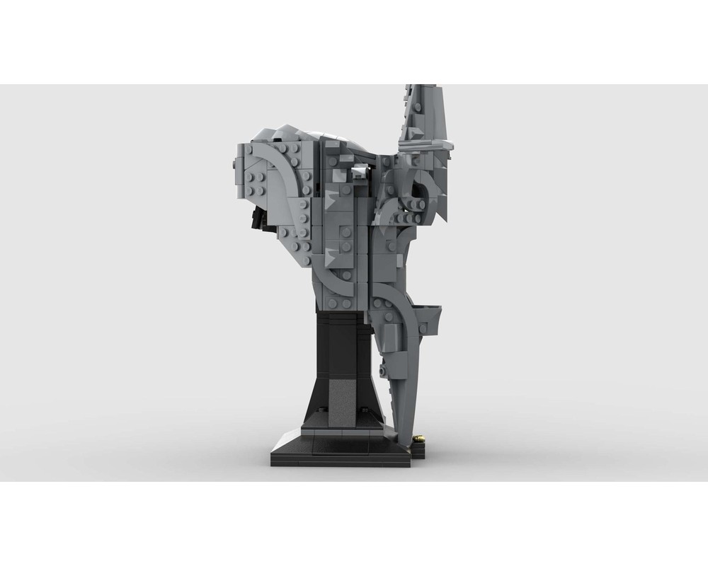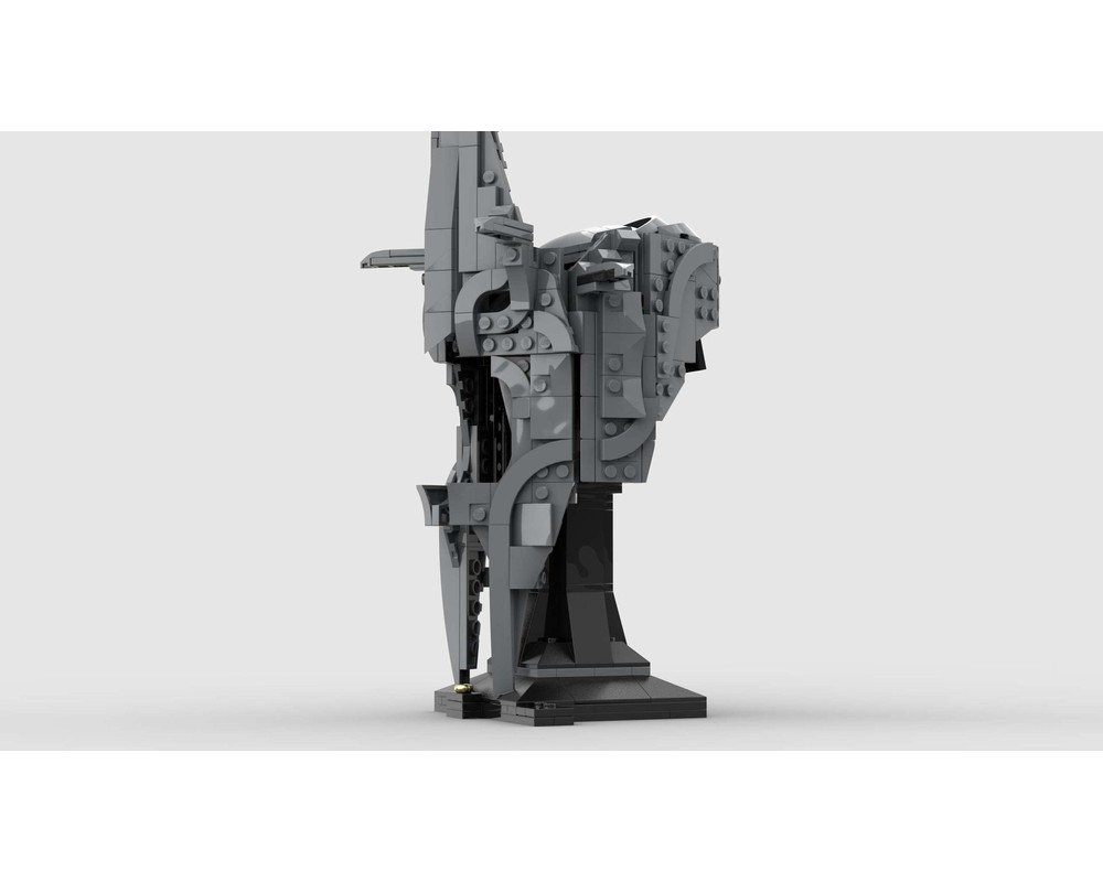 There is no visible face beneath the helmet, instead it opens below the eye-holes with two long downward curving prongs that look almost like iron fangs, giving the impression of a twisted metal skull. Wedge plates and curved slopes create a recessed void, an empty gaze that suggests no physical features beneath, only darkness. Wurger Bricks had to raise the display stand slightly to accommodate for the new length of the helmet. Also instead of the Sauron plaque, the creator placed the Ring on a jumper plate at the base of the stand, symbolising how the Nazgul are enslaved to Sauron through the Ring.