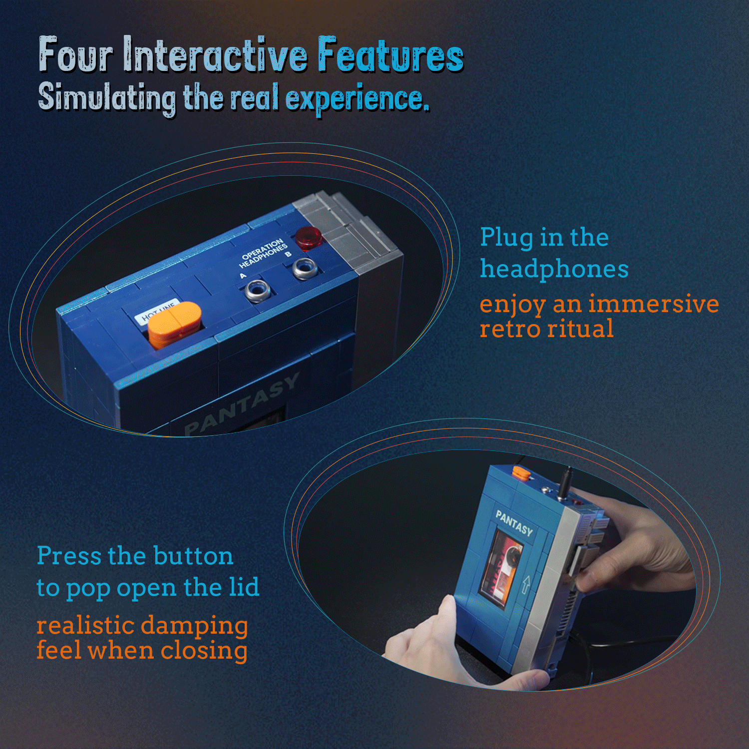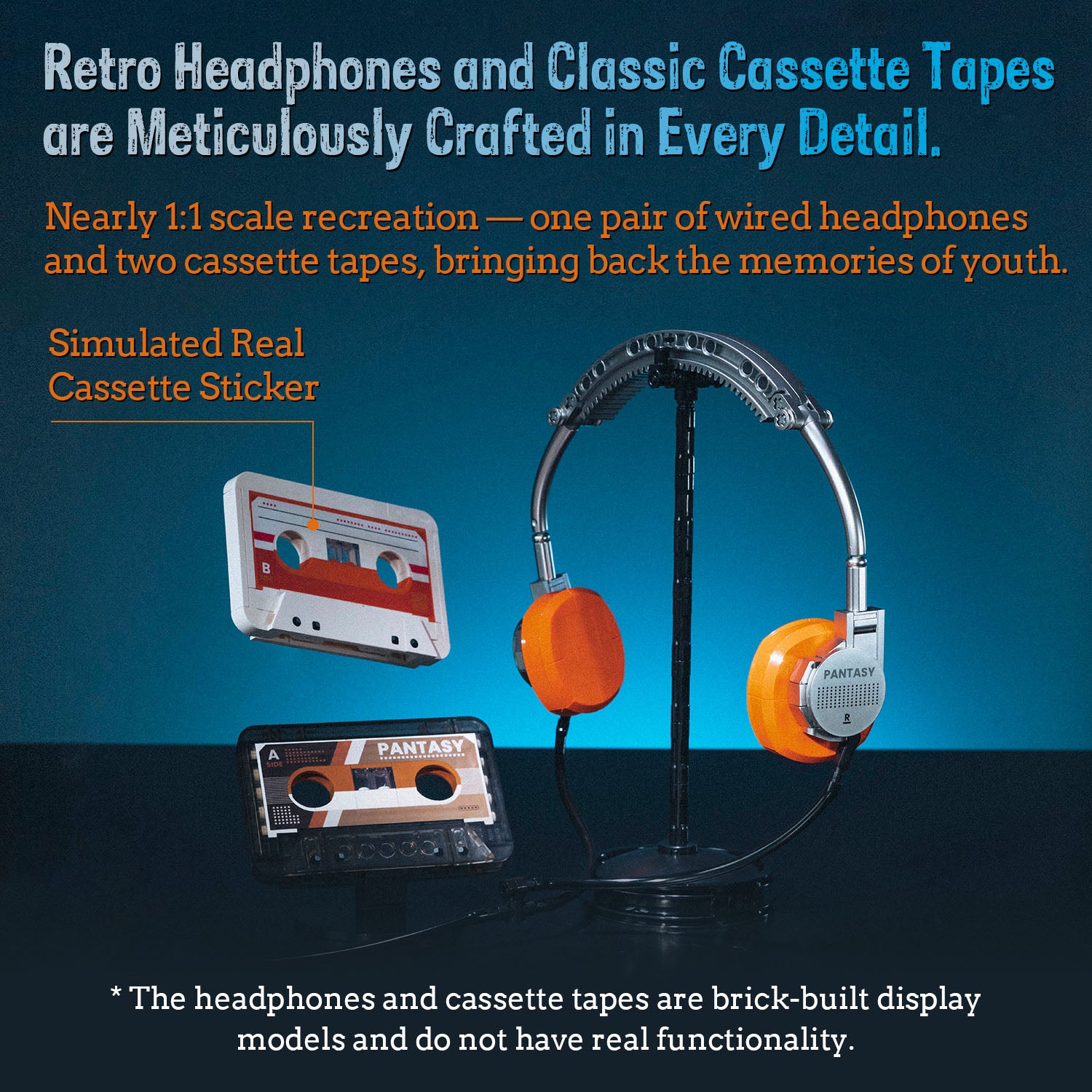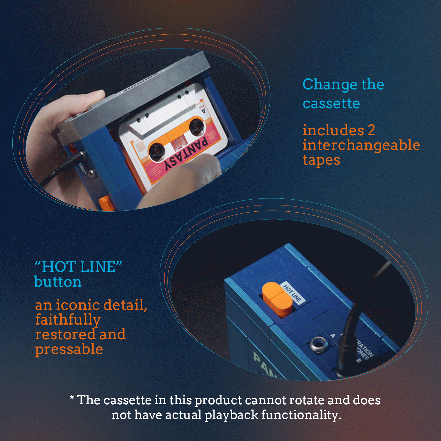 Designed with engaging, hands-on features: connect the headphone cable, press the cassette door with realistic resistance, swap between two exclusive cassette tapes, and activate the classic red “HOT LINE” button. Each interaction enhances the nostalgic building experience. Includes the cassette player, two interchangeable cassette tapes, and retro headphones, each supplied with a dedicated display stand. Display them together as a complete retro scene or separately as stylish desktop décor.