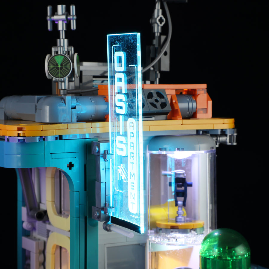 Comprising of 2,507 pieces and 7 figures, it boasts a great atmosphere filled with life. Explore the inhabitants’ living and environment with a detailed interior. Outside is just as busy, with a shop, hacker, mechanic and neon lights galore.