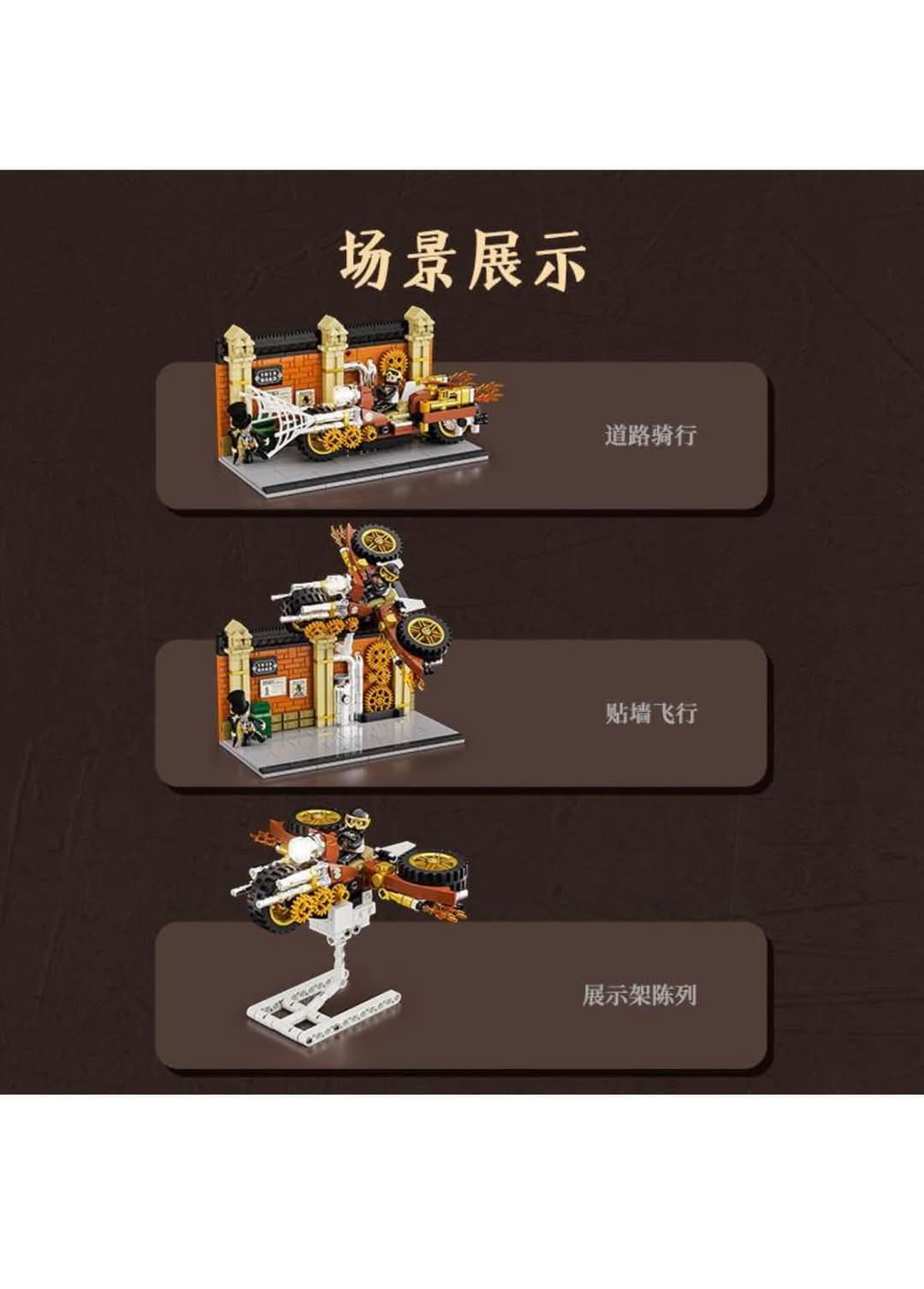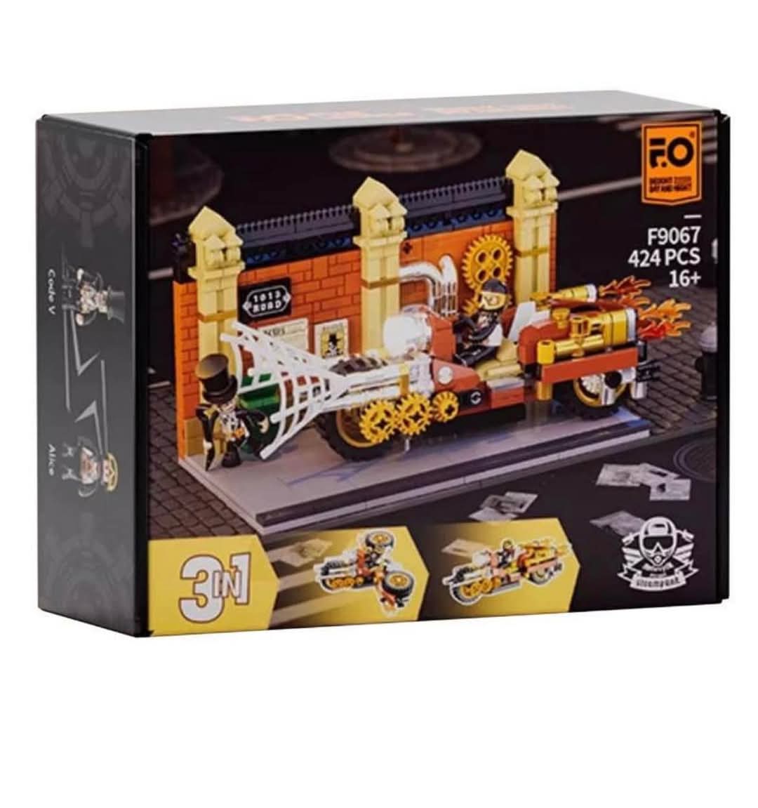 There isn’t a lot of information surrounding the set currently but we can see from the images it features a Steampunk Motorcycle build and small section of brick-built wall. It is unclear if there are other builds or the 3-in-1 aspect is simply displaying it in 3 different ways. It will comprise of 424 parts and 2 Figures, measuring 19cm wide / 10.9cm tall / 9.6cm deep, it looks as though it’ll fit nicely in the FunWhole Steampunk series of sets. It will come with its own light kit as all FunWhole sets do, the narrower battery pack discretely ticks away under the vehicle.