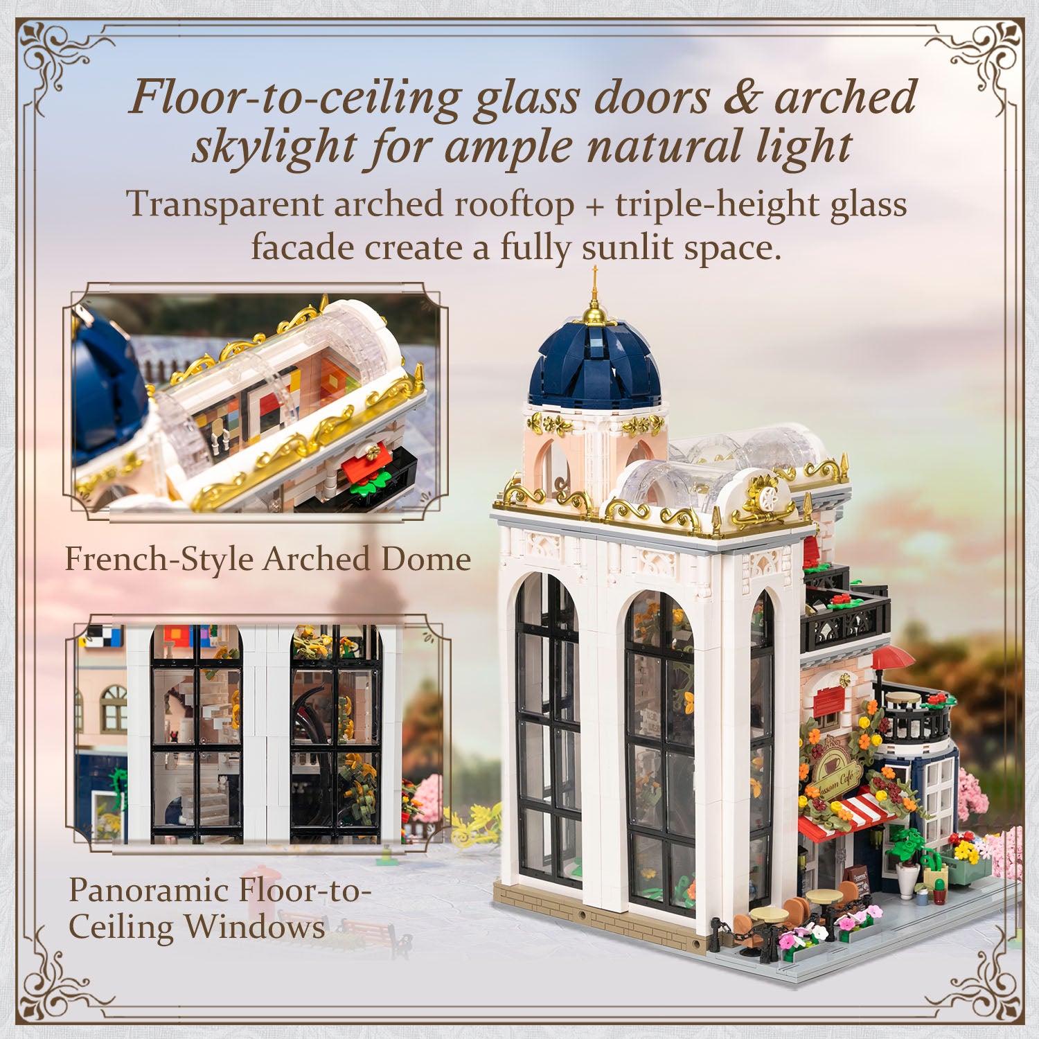 The Blossom Café offers a building experience that is both soothing and refined. This three-story modular is inspired by a classic European style, where elegant architecture blends with delicate floral elements. Its light coloured brick façade, punctuated by flower-filled balconies, ornate windows, and a large side glass roof, creates a visual effect that is as charming as it is realistic. The transparent arched roof lets natural light penetrate into the heart of the building, transforming this construction into a true urban haven to proudly display in any collection.