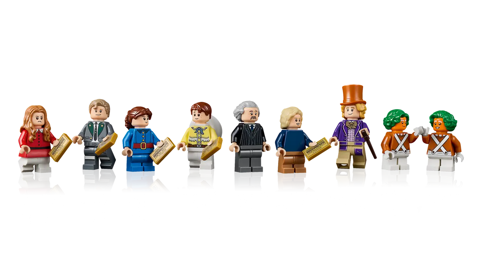 - 9 LEGO® minifigures – Recreate memorable scenes with Willy Wonka, Charlie Bucket, Grandpa Joe, Augustus Gloop, Mike Teavee, 2 Oompa Loompas, Veruca Salt and Violet Beauregarde minifigures