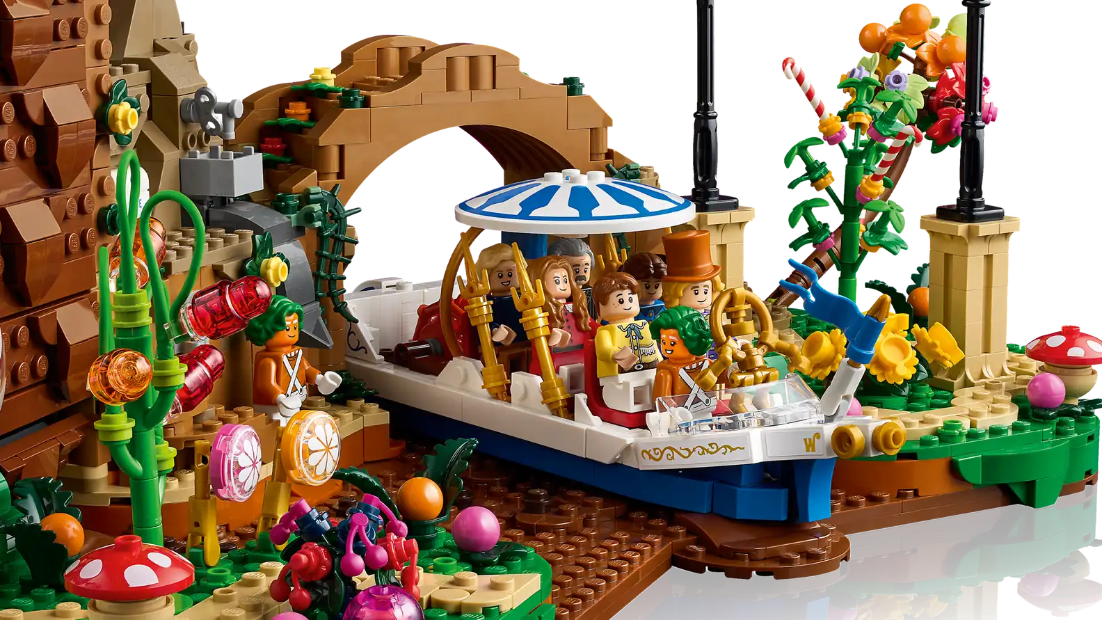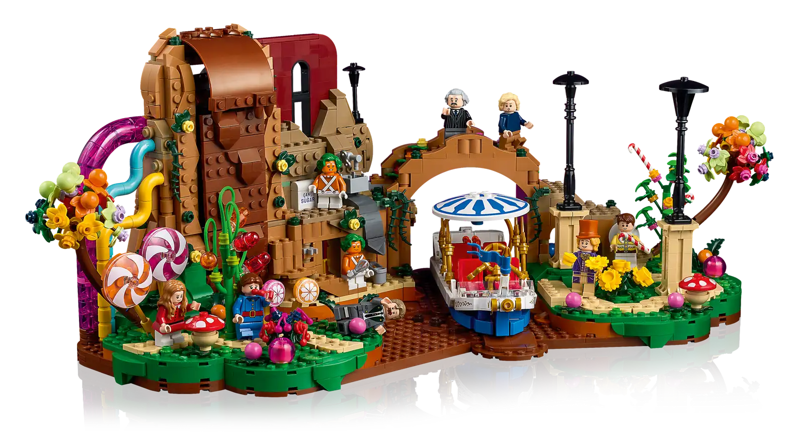 - LEGO® brick-built authentic details – The chocolate waterfall with colourful pipes, Wonkatania boat, work area for the Oompa Loompas, Willy Wonka’s office with a secret door, candy plants, and more