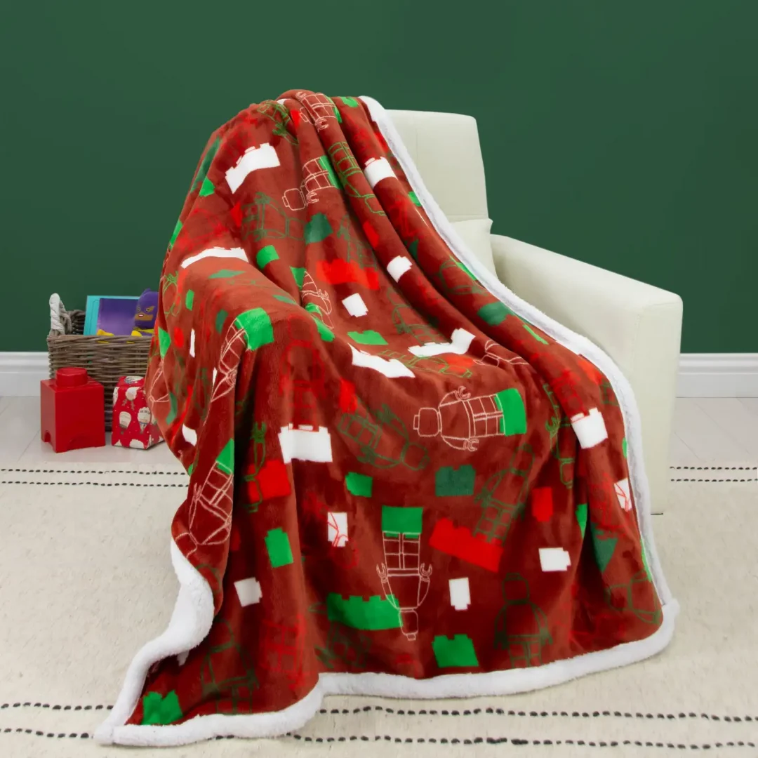 - Holiday gift idea for kids and adults – Get cozy during winter with this LEGO® Sherpa-Backed Throw, featuring a festive graphic of LEGO minifigures and red, white and green LEGO bricks