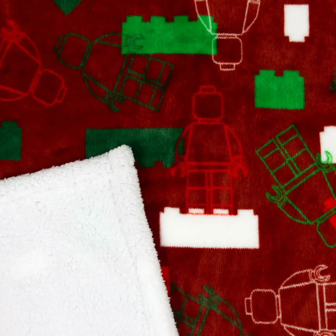 - Holiday gift idea for kids and adults – Get cozy during winter with this LEGO® Sherpa-Backed Throw, featuring a festive graphic of LEGO minifigures and red, white and green LEGO bricks