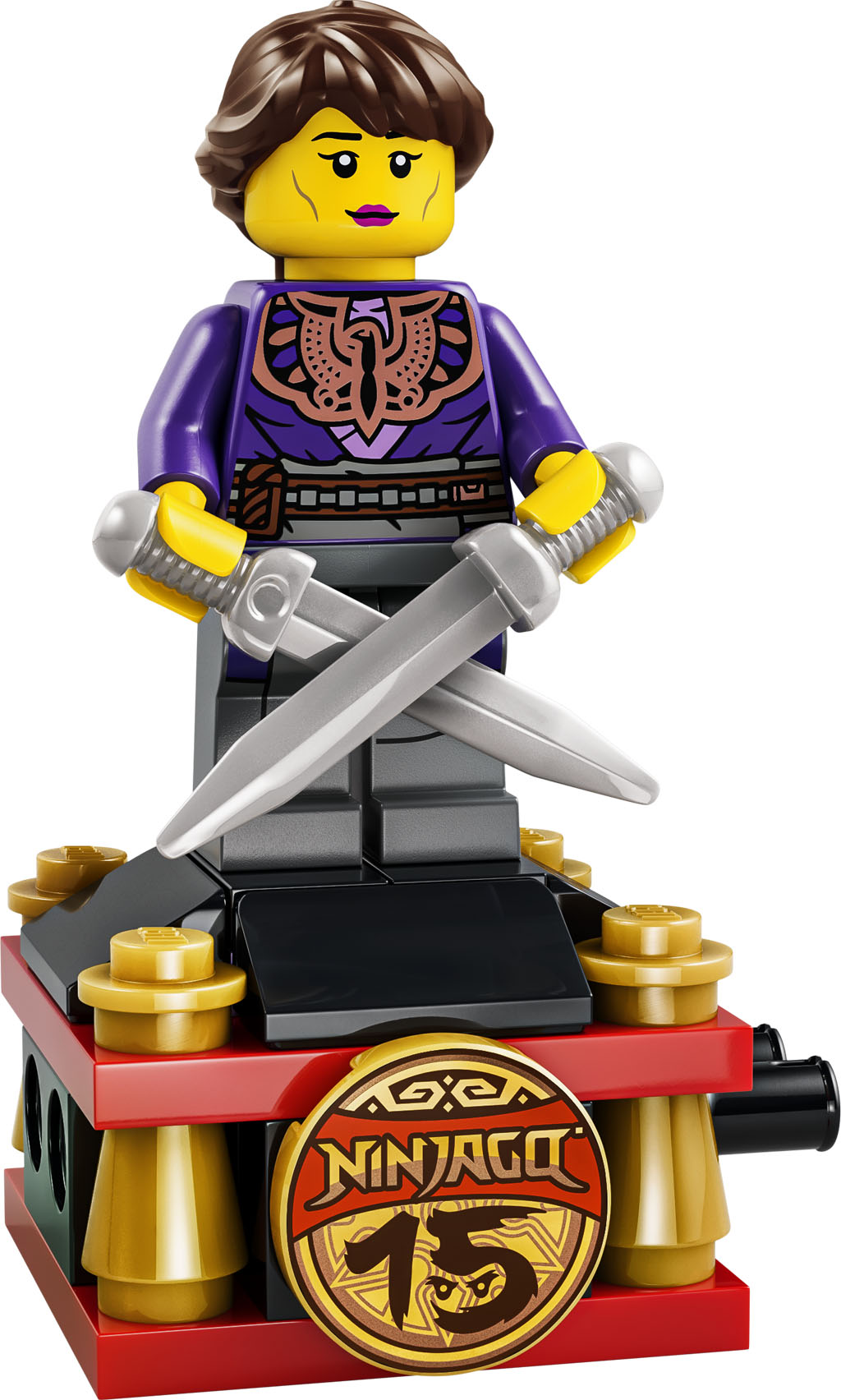 - 3 NINJAGO® MINIFIGURES – Role play adventures with Kai, the villainous General Cryptor and for the first time the Elemental Master of Shadow, who can be placed on a stand with a celebration coin