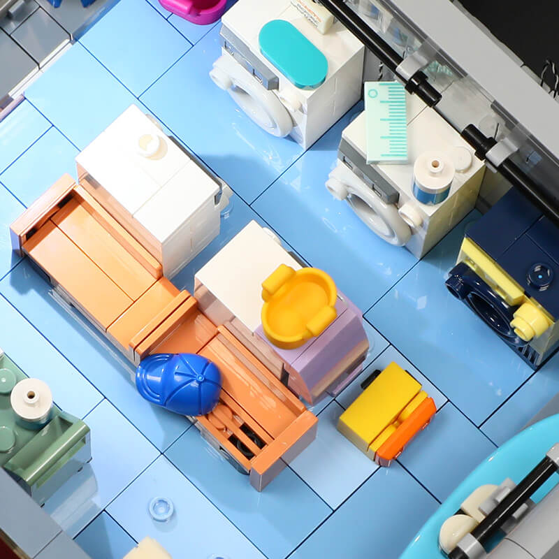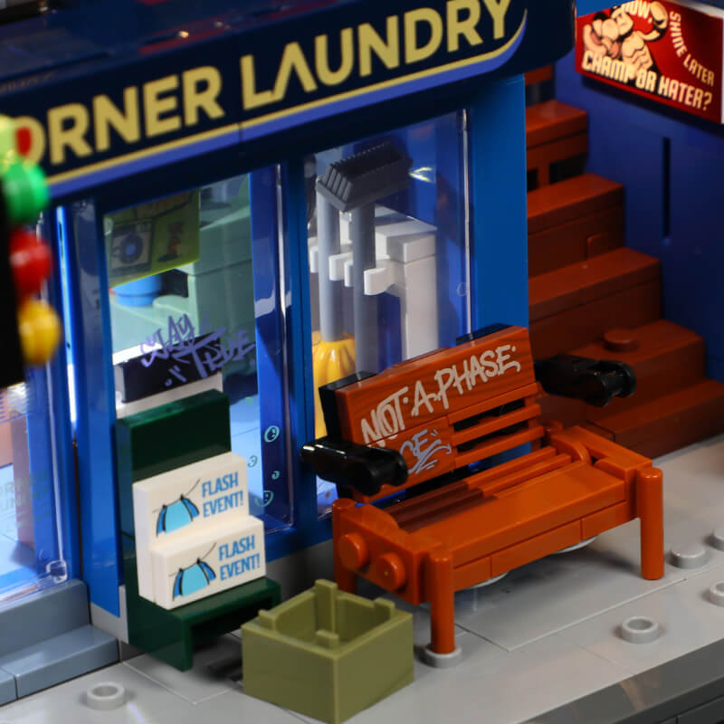 Featuring a rotating boxing ring and movable scaffolding, this four-tiered system delivers a visually engaging, modular, and dynamically interactive immersive construction experience. Ground floor laundry shop and changing room, second-floor boxing ring, third-floor gym, and fourth-floor warehouse secret base—complete with washing machines, movable boxing ring, fitness equipment, and rich details—create an immersive urban living environment. Includes over 90 printed pieces, featuring numerous street-style graffiti designs.