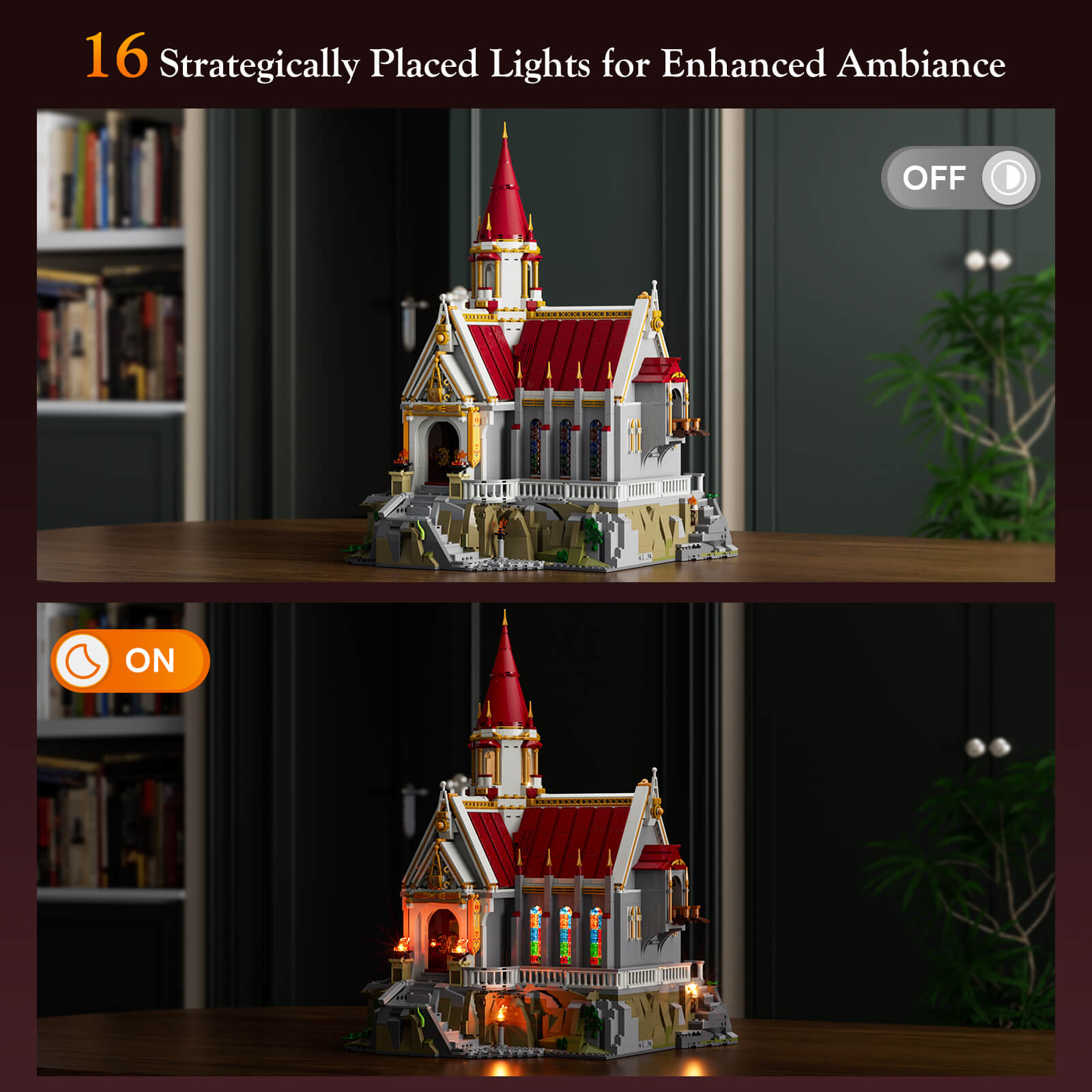 Featuring 16 visible light points, both exterior and interior surfaces can be illuminated, immersing users in darkness and recreating the nocturnal ambiance of a medieval treasury. Built within the mountain, this Gothic treasury embodies medieval architectural aesthetics while fulfilling collection and exhibition requirements. Not just for display! Enjoy a two-level design with four interactive sides, 13 movable parts, and a hidden ring surprise that brings every detail to life through play and imagination. Faithfully recreates Gothic castle details in realistic style, featuring flying buttresses, pointed arches, ribbed vaults, and stained-glass windows. Enhances satisfaction for history enthusiasts and nostalgia-seeking users, emphasizing the model’s meticulousness and depth. Includes 5 minifigures — king, steward, envoy, guard, and thief (plus a maid outfit). Perfectly pairs with L9071 Banquet Hall to bring your own medieval tale to life.