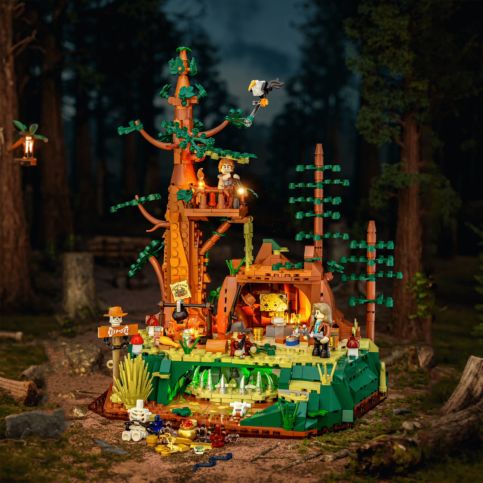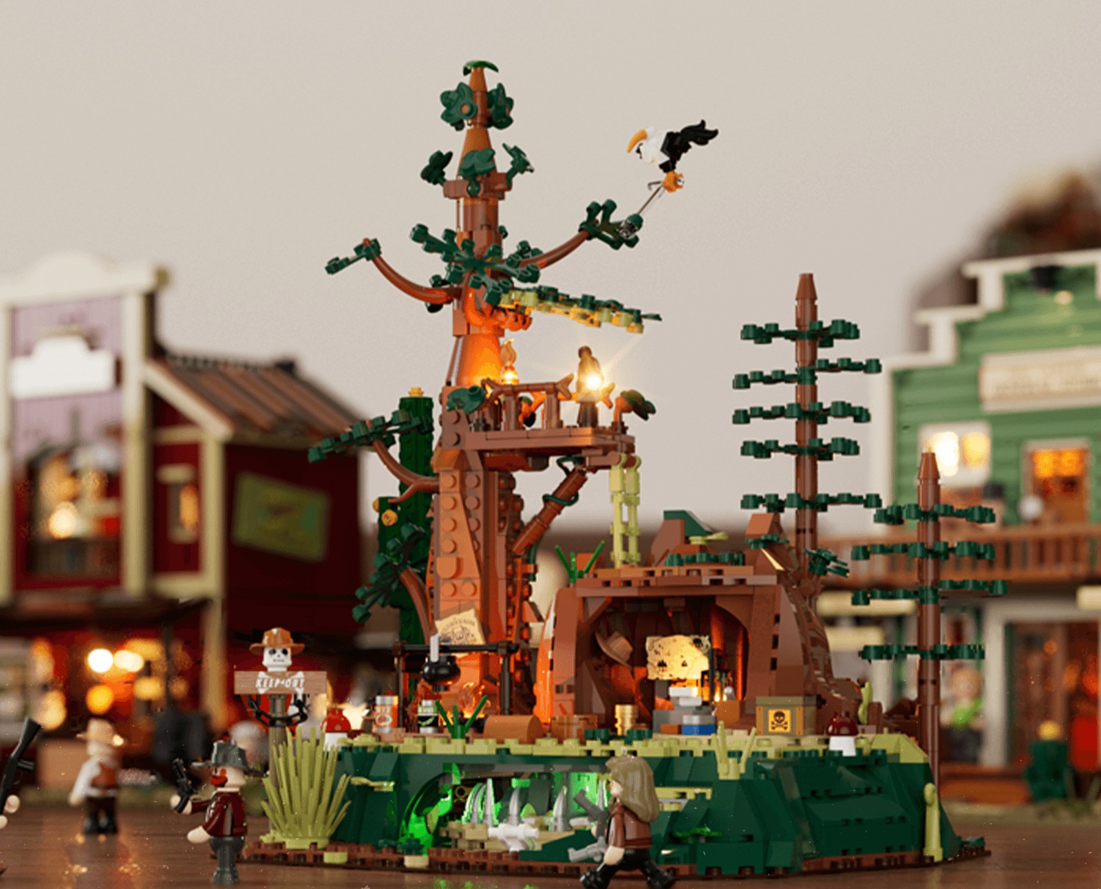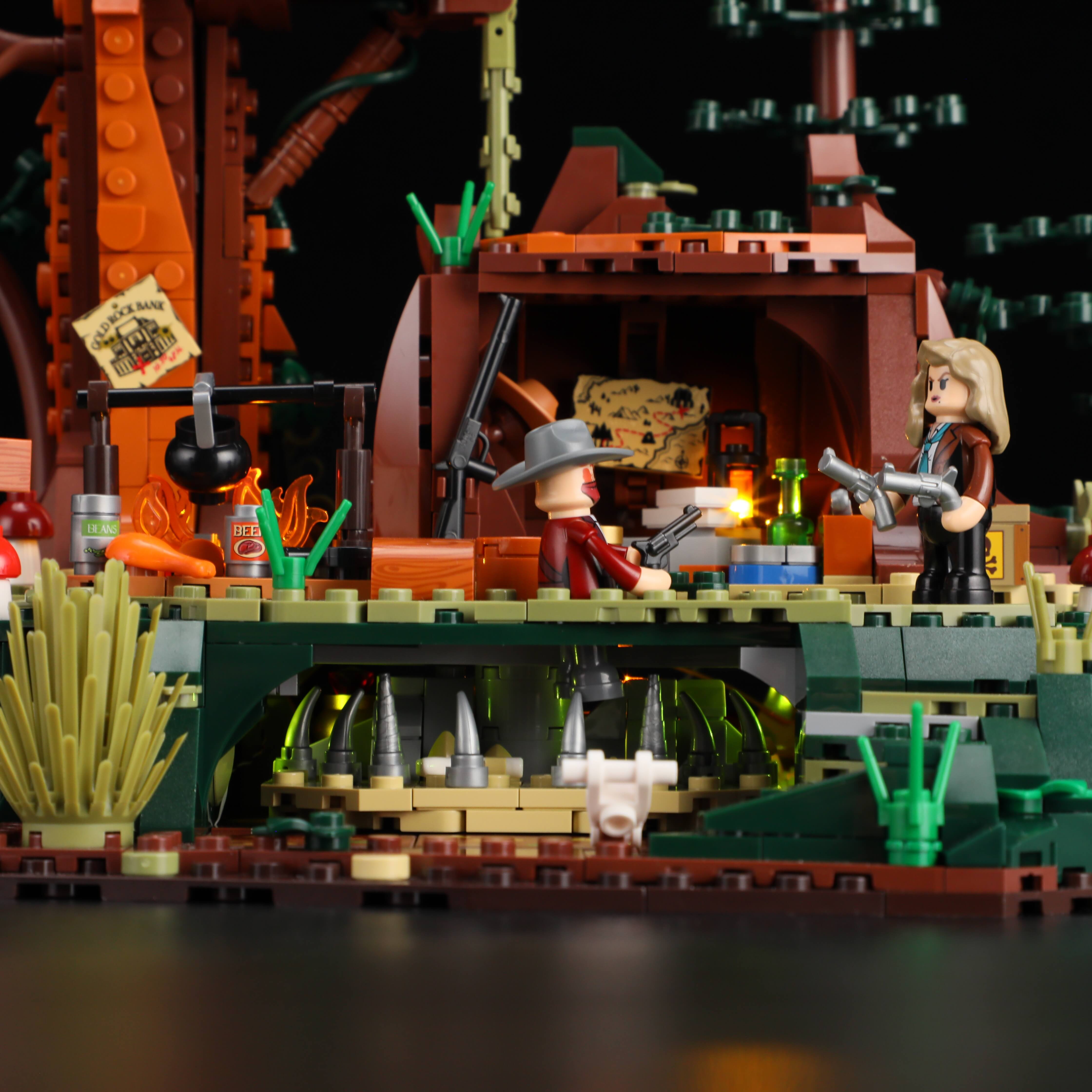 7 illuminated zones,2 light strips, and 1 floor switch. Multiple light sources interact with structural mechanisms to reveal authentic and dynamic scene details. Unlike common desert settings, this product is set in a redwood forest far from small towns, highlighting the iconic environmental features of the American West. Realistic vegetation and prop designs create an immersive western atmosphere. Shatters the traditional image of peace and prosperity in Western-themed products, showcasing the lives of lawbreakers in the Old West. Includes 2 outlaw figures and 1 pursuer figure, brimming with conflict and adventure. The bandit gang utilizes the natural terrain of the redwood forest to set up spike traps against intruders. Observation posts atop the redwoods monitor the surroundings, while stumps serve as hiding spots to evade pursuit. Hidden treasure caves are cleverly concealed within the landscape. Through intricate mechanisms and environmental elements, it recreates the tense and mysterious atmosphere of jungle surveillance.