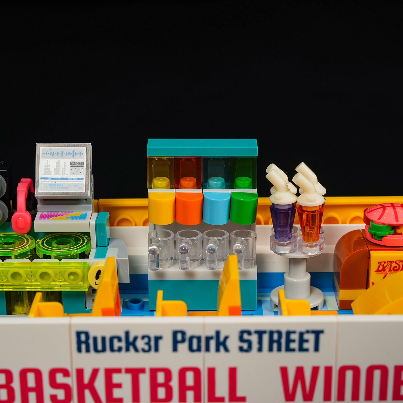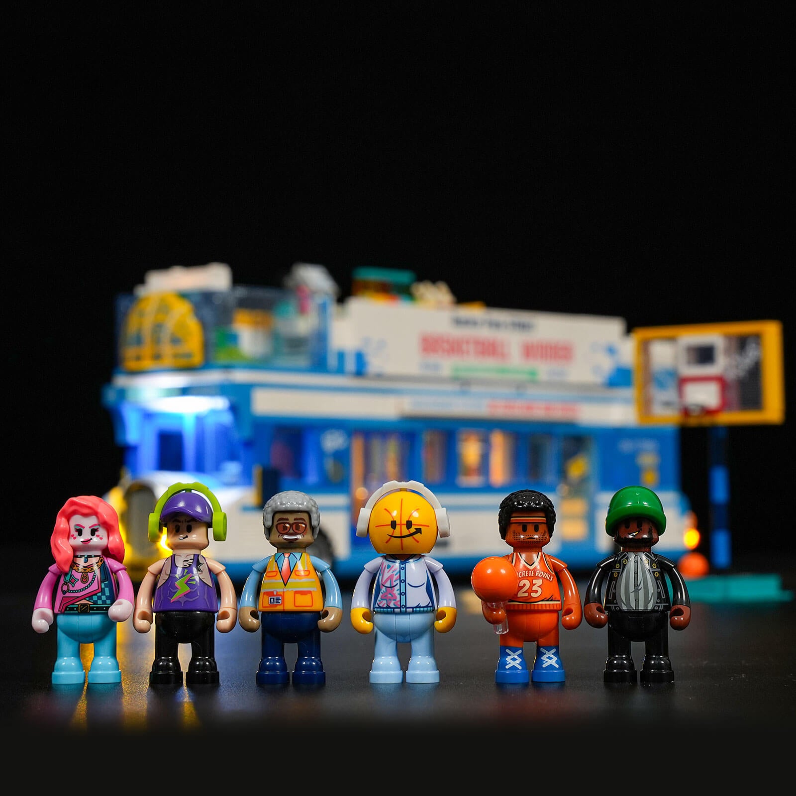 The set includes 6 uniquely designed minifigures with varied skin tones, hairstyles, and outfits, each paired with a collectible card to satisfy collectors. The bus’s upper deck includes a DJ console, bar counter, burger station, and game broadcast TV module, which all can removable. Includes a mini basketball hoop to enhance the theme. Designed to complement street-themed sets like the Graffiti Bus Stop, this bus offers interchangeable station signs and double-sided prints, retro and graffiti styles, for extended display options. From interior and exterior functions to chassis structure, every detail of the real-life bus has been meticulously recreated. The bus is ideal for street scene layouts while also showcasing it in display cabinets.