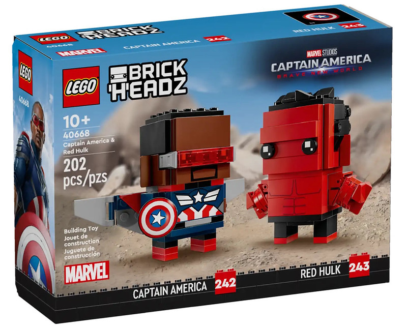Earlier today we shared news and images of two LEGO Marvel sets based on the upcoming Captain America: Brave New World movie due early next year. A new BrickHeadz set has been revealed and comprises of brick-built Captain America and Red Hulk. The double pack features Sam Wilson’s Captain America and the Harris Ford’s Red Hulk. Just like previous LEGO BrickHeadz sets, they follow the same build style and process, including their brick-built bases.