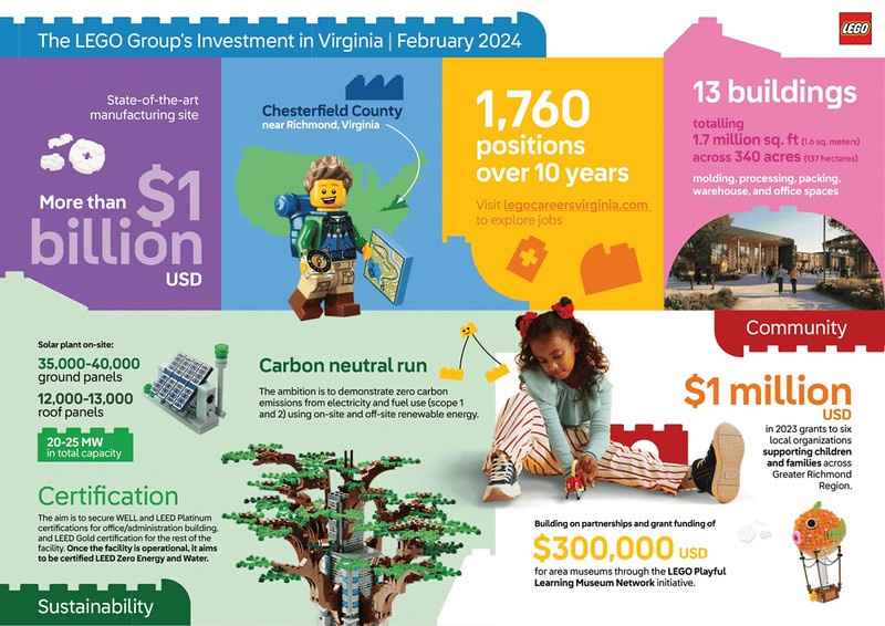 In 2023, the LEGO Group broke ground on its new billion-dollar manufacturing site in Chesterfield County, near Richmond, Virginia, US. LEGO has announced a permanent program lead and general contractor.