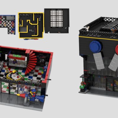 Next to the mechanics on the ground floor is a small food store, it has a curved front and is tucked away around the corner. Inside the store you’ll find food items on shelves and a light on the ceiling. Stairs are conveniently placed by the side to allow the Apartment residents access to the first floor, although there isn’t an access hatch making it impossible get to, we’ll overlook this as it can’t be seen when looking at the finished set.