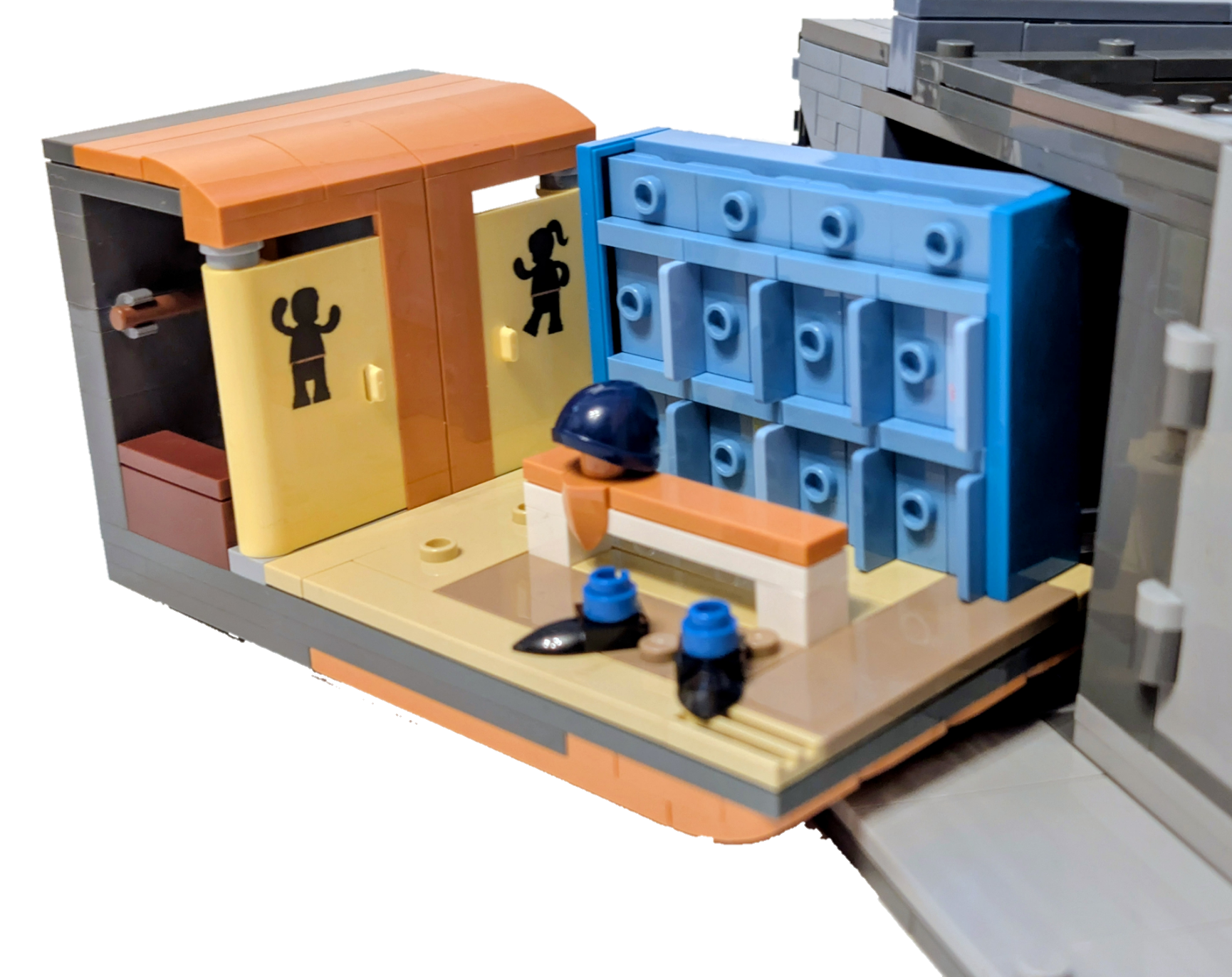 The second floor is also special, it’s the first gym space LumiBricks have made, this too can be slid out for easier access and scene setup. Inside the gym itself you’ll find the typical equipment, benchpress, bicycles, weights, and punchbags. The way the punchbags hang is great, although I did modify then ever so slightly, in the manual it tells you to connect the tip arm to hanging bag, but ease these off a little and the bags actually now hang snd swing, perfect.