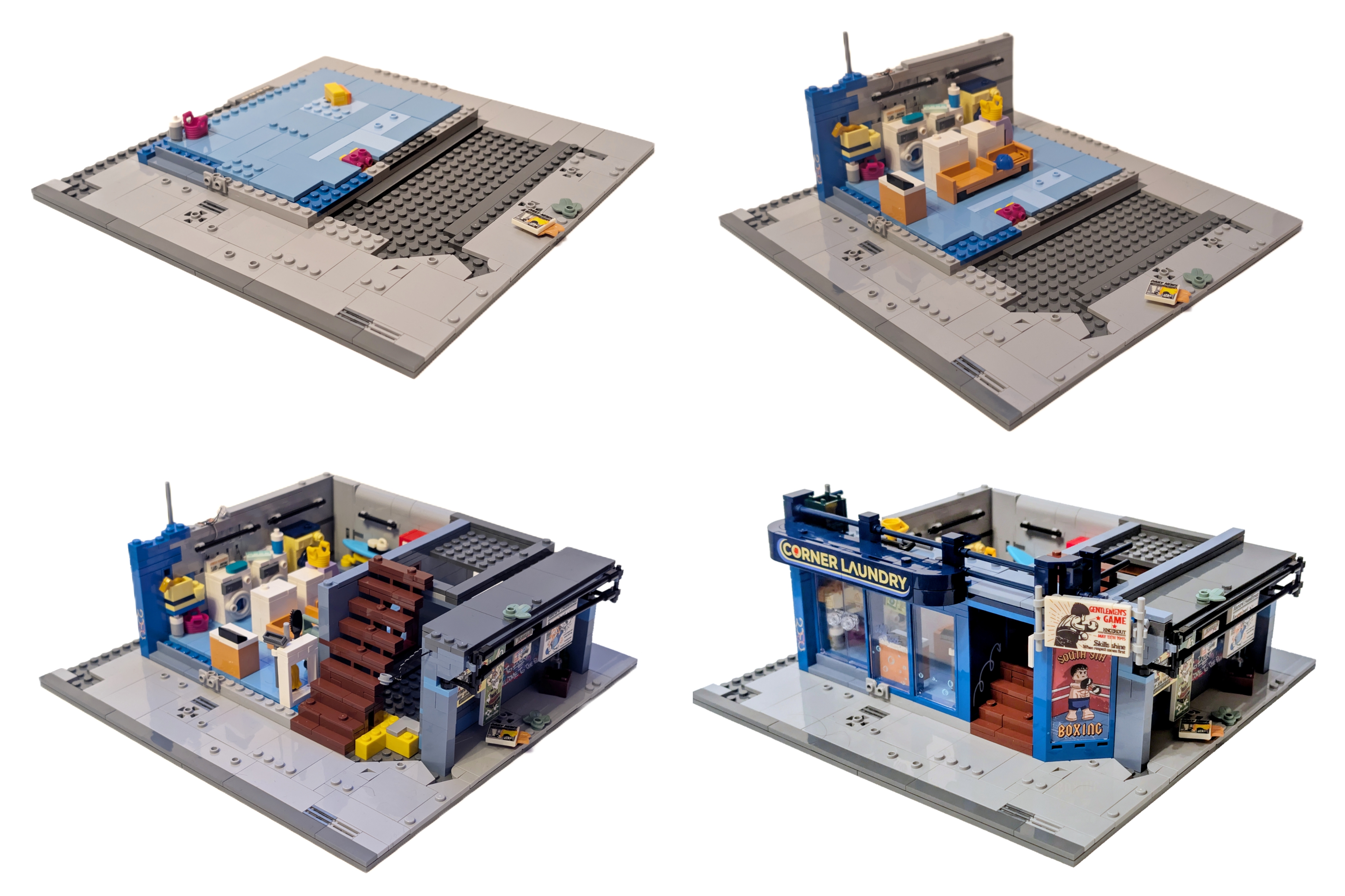 The first handful of bags make the ground floor, starting off with the extremely satisfying tiling. The left hand side is actually quite narrow, with a staircase and shelter running down the right hand side. The ground floor is a Laundromat, and a mighty fine one too, with several machines ready to tackle the gym gear thrown at it after a good workout session upstairs.