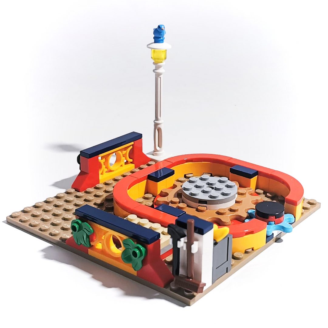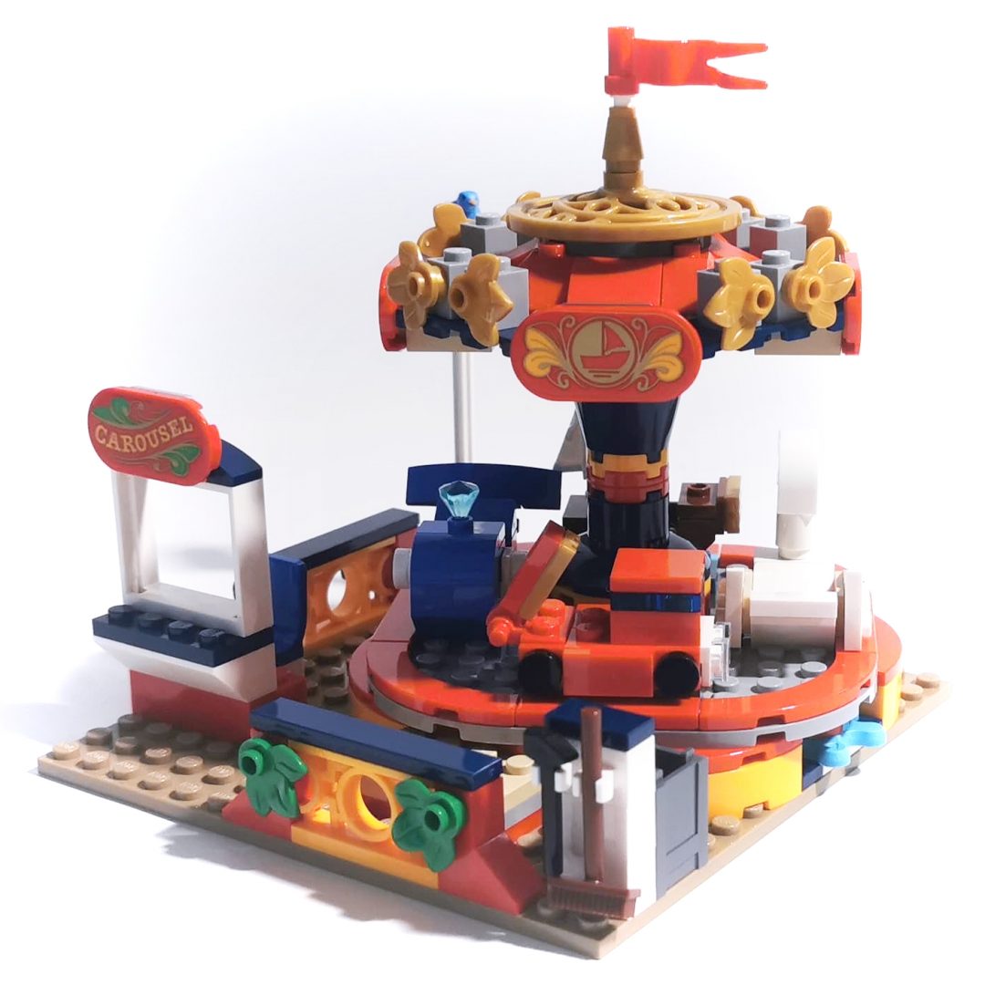 Bag 2 builds upon the base with the spinning platform and the individual ride seats, which including cute micro versions of a Swan, Pirate Ship, Whale and a Firetruck. A lamppost is also added with a little blue Bird in top.