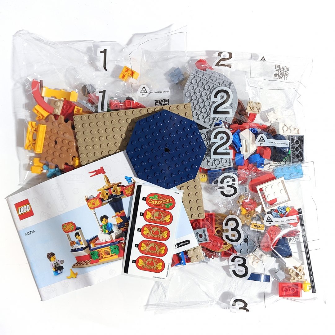 Inside the box you’ll find the usual things, numbered bags, instruction manual and a small sticker sheet. There are 5 stickers in total, all similar in style but with a key different, the little emblem in the middle. There is also a ‘Carousel‘ labelled one, this one sits on top of the small ticket booth at the front of the set. There are also two plates that come unbagged, a 16×16 dark tan plate and a 10×10 dark blue hexagon one.