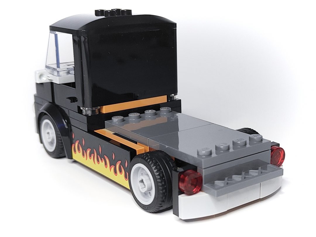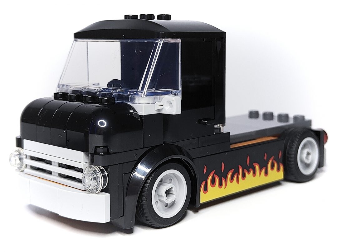 Bag 1 is the Truck and is fairly simple in construction. Starting with the base you build up the sides, adding wheel arches at the front, printed ‘flame‘ tiles along each side and a flat section at the back where the Burger shack will sit.