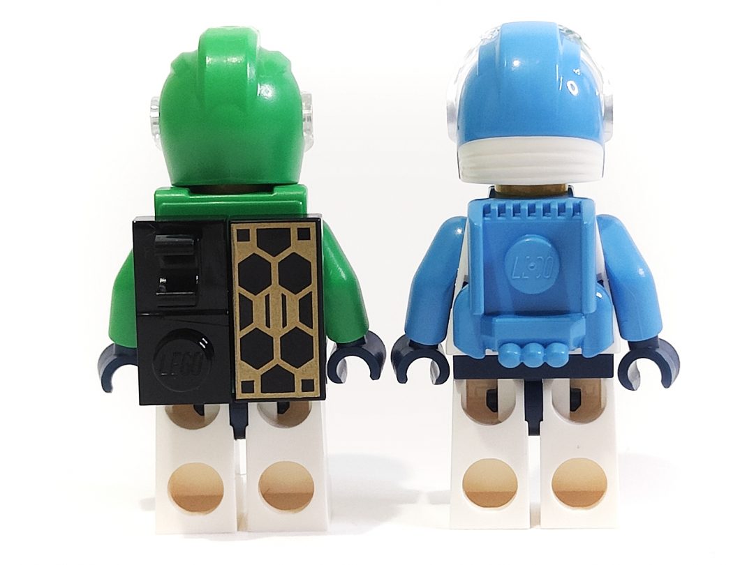 Each Minifigure has a backpack, again different in mould. The Green one has a printed tile and a 1×2 stud/clip piece attached to it whilst the Blue one has just a bare stud, for attaching an accessory too later.
