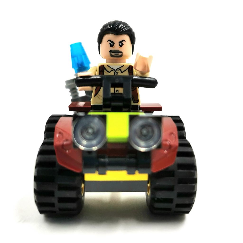 Being only 35 parts, that includes the Minifigure, it’s not a particularly complex build. The main body is based on a 2×6 baseplate, two technic wheel pins and a few 1x2s chucked in for padding and detail. That being said it does the job it is designed for, an All Terrain Vehicle. The wheels are big enough to navigate obstacles within the Minifigure scale World.