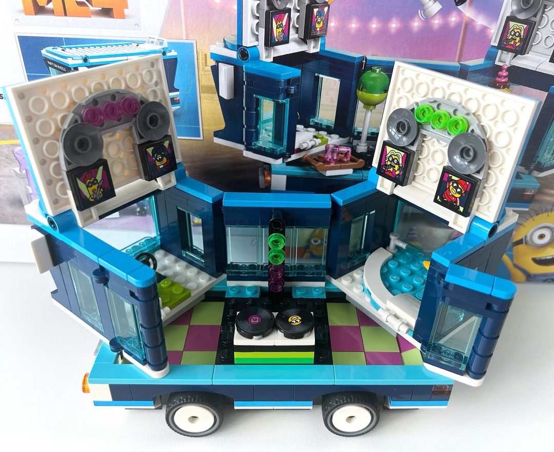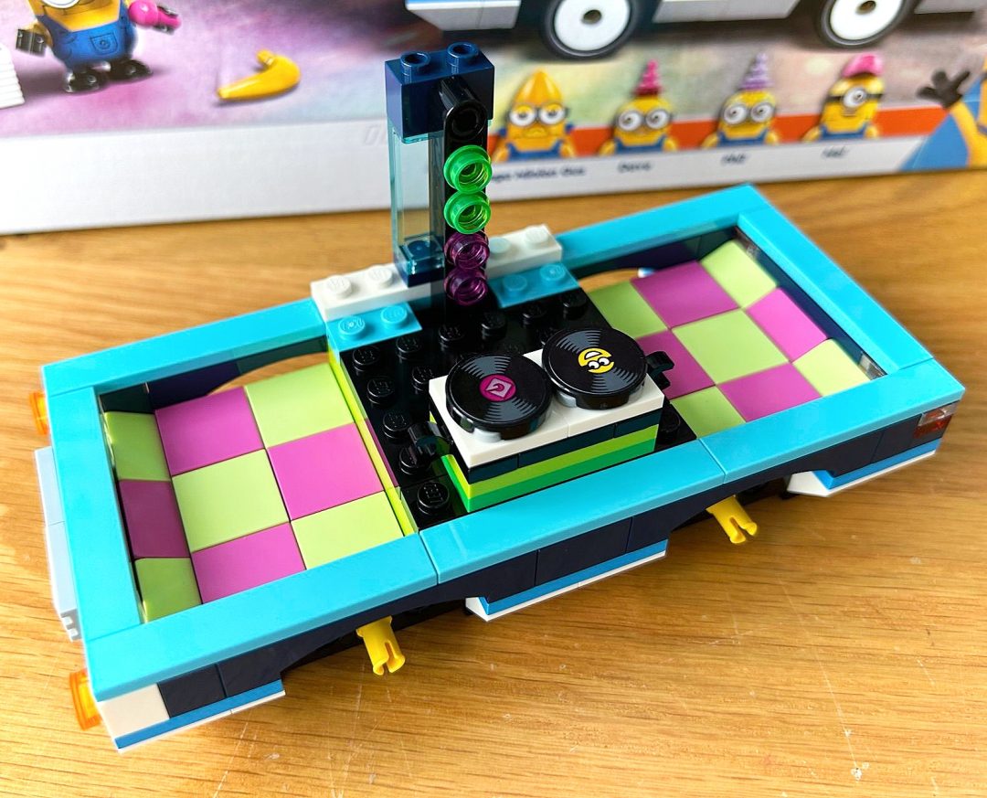 The bus opens up on one side so that you can see the dance floor and the disco area. The roof opens up too, giving access to the TV screens which have some cool stickers of Minion in various music poses.