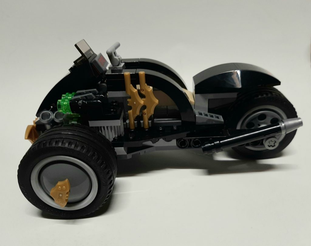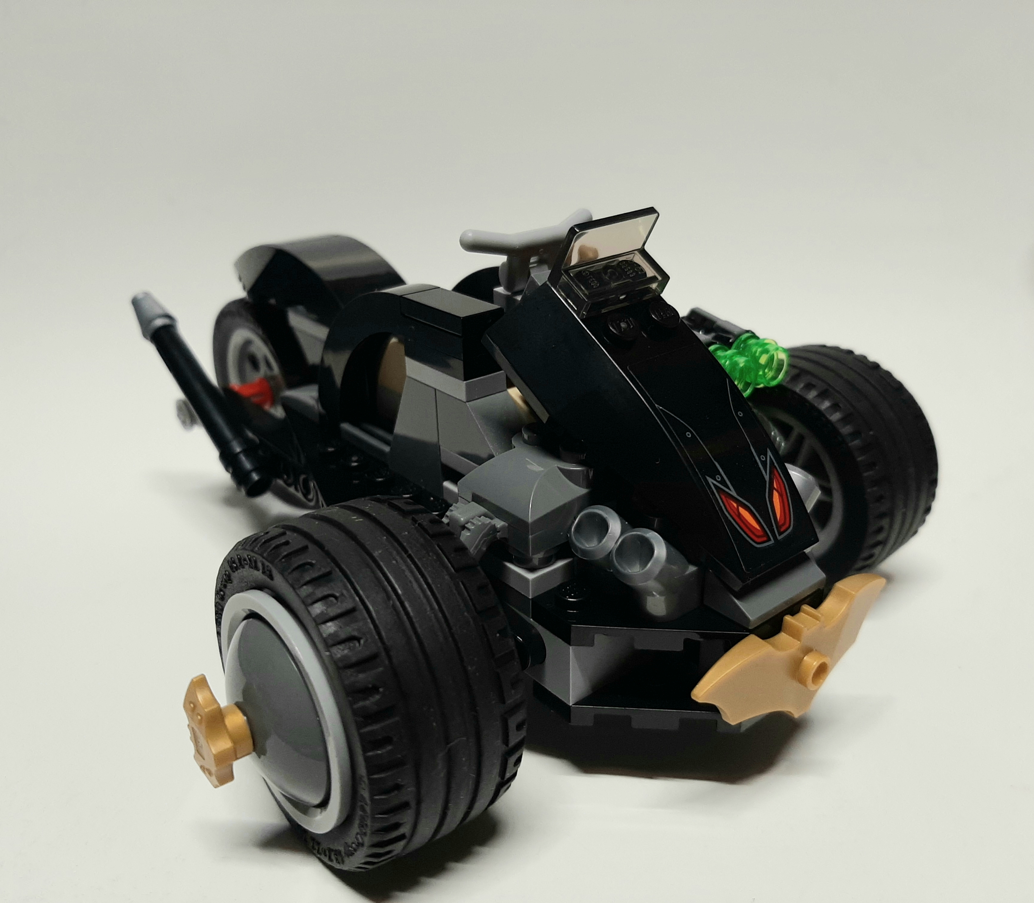 There are 2 angled exhausts on either side of the single back wheel. We can attach more of the gold bat logo pieces on both of the front wheels as well as the front of the trike itself. One of the stickers adorns the black sloped front.