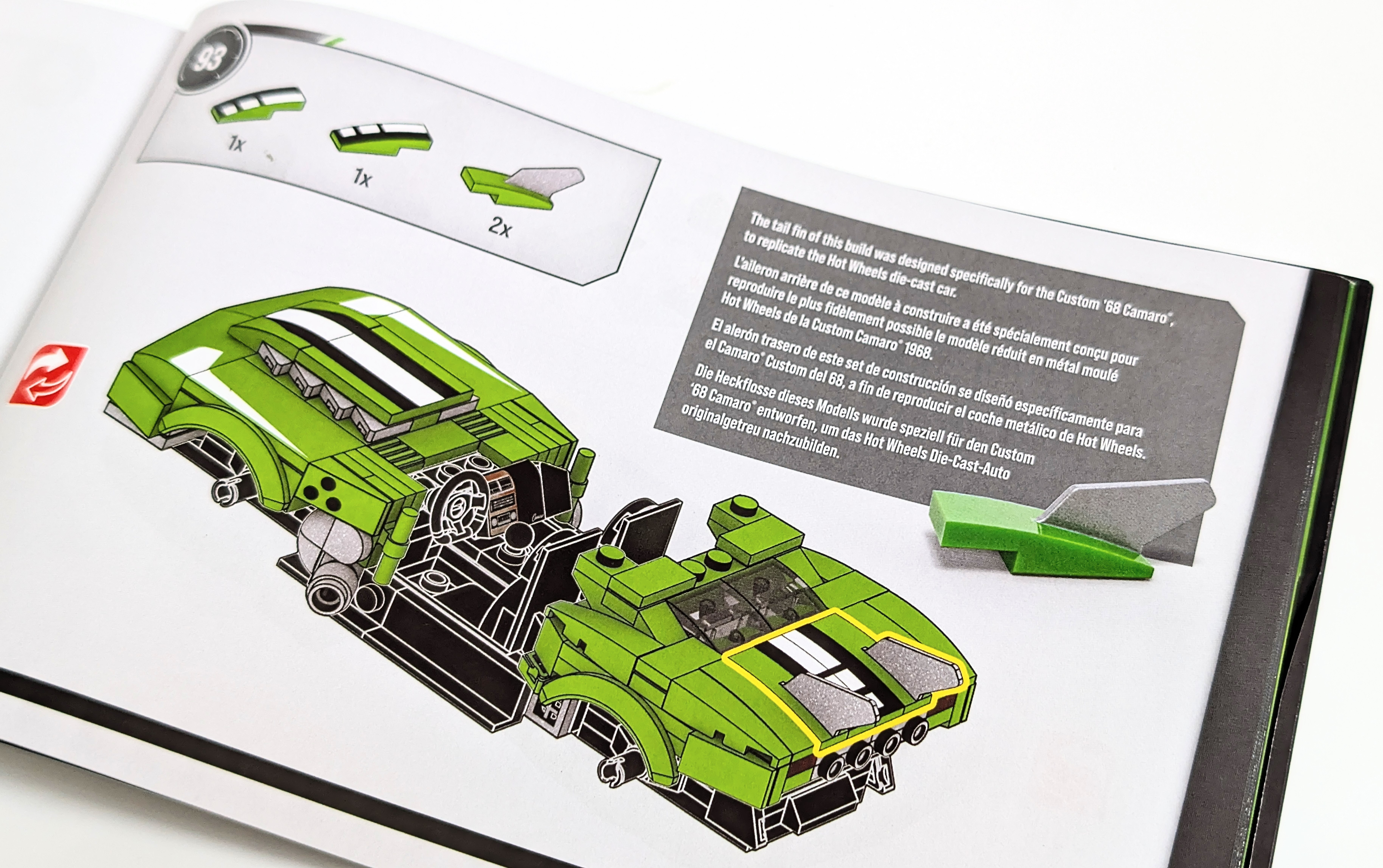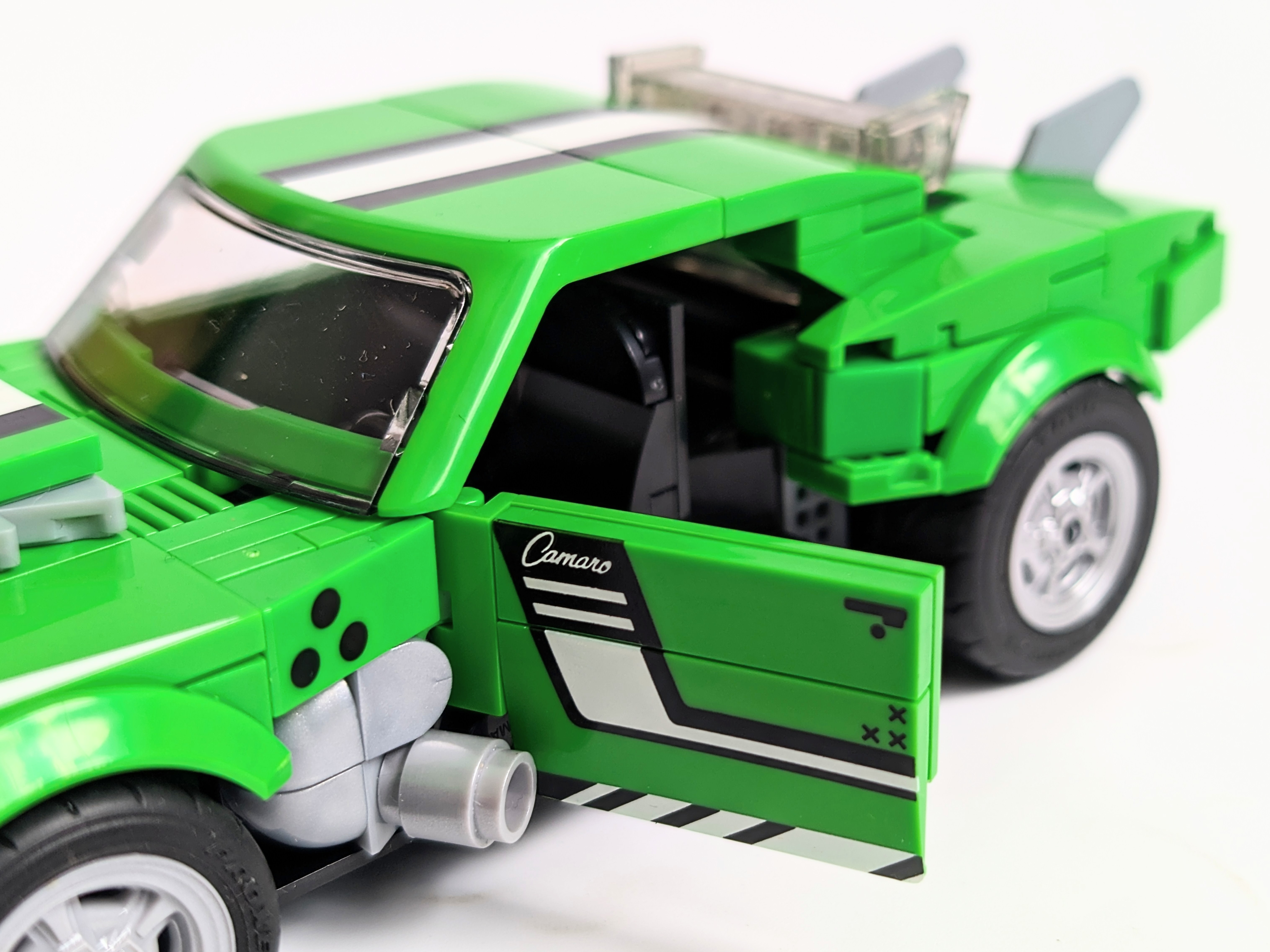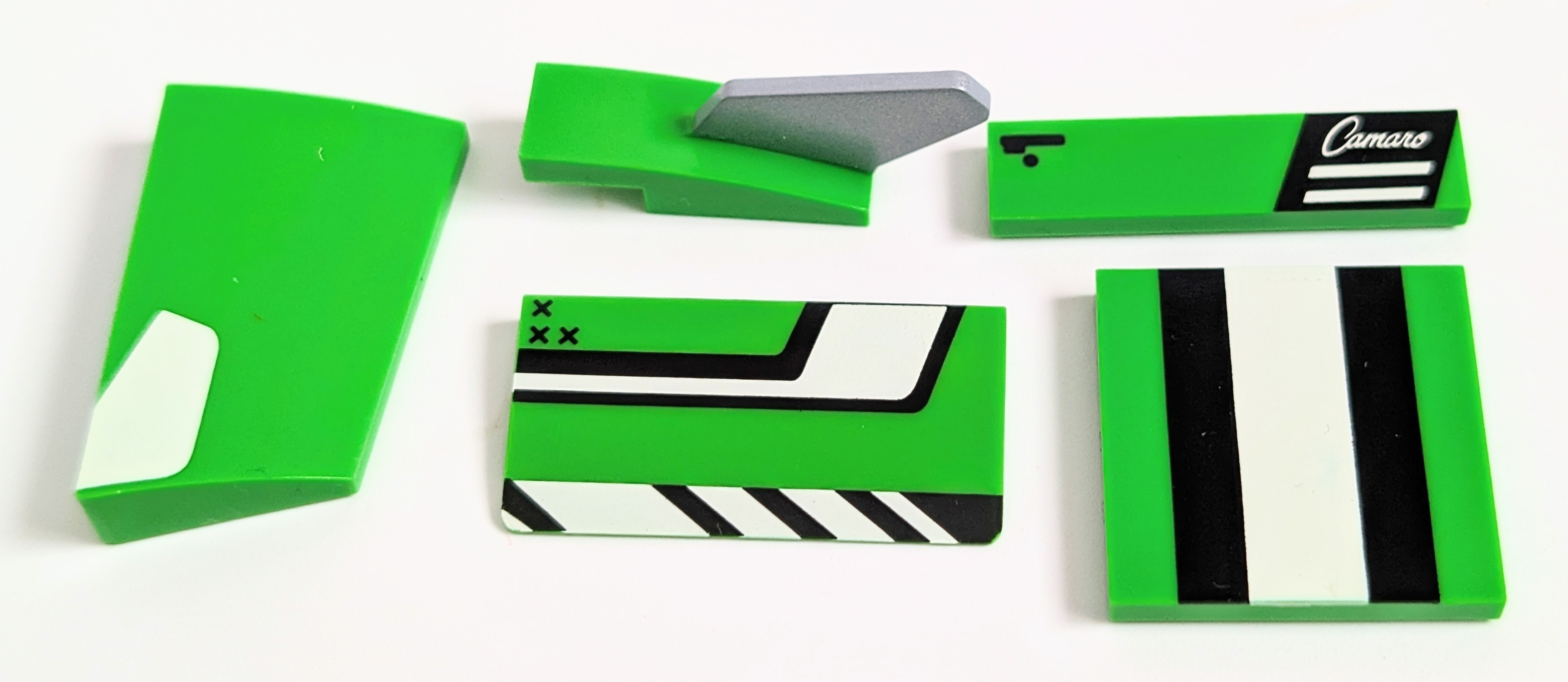 The build is very enjoyable and laid out in an easy and straightforward way. Starting with the base of the vehicle and layering parts up to eventually build the car in question. The parts that make up the main build at solid, well made and printed (where needed), see the photo below for just some of the prints and specialist parts used in this set, the silver tail fins are my favourite along with the Camaro logo.